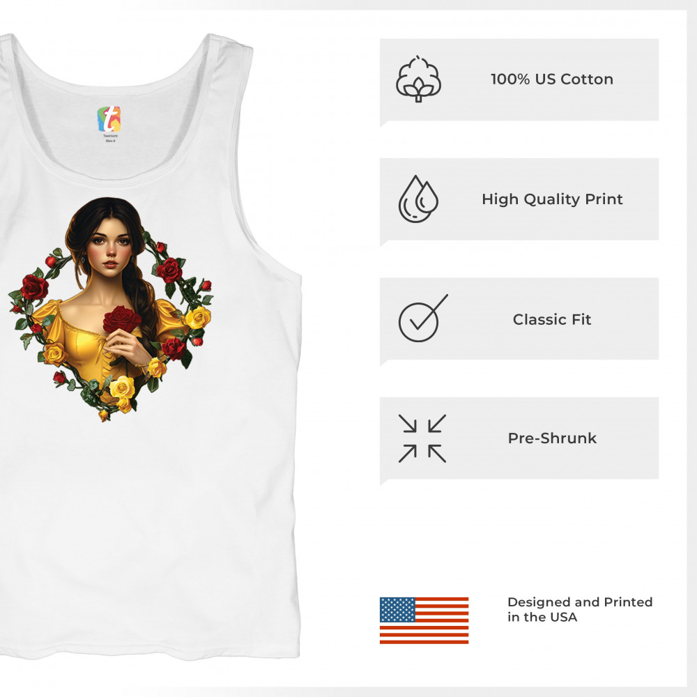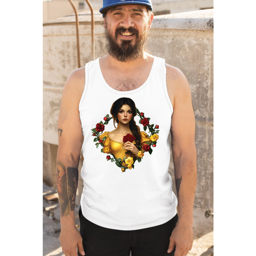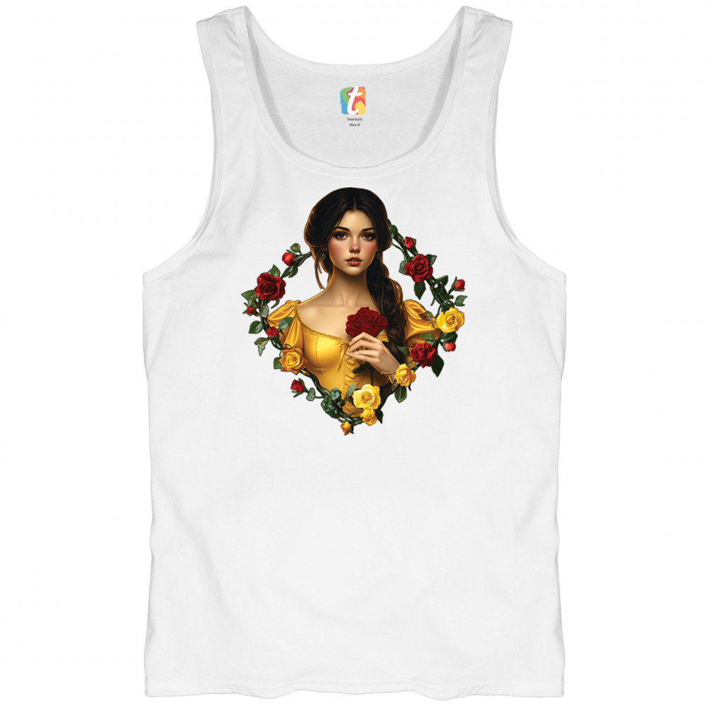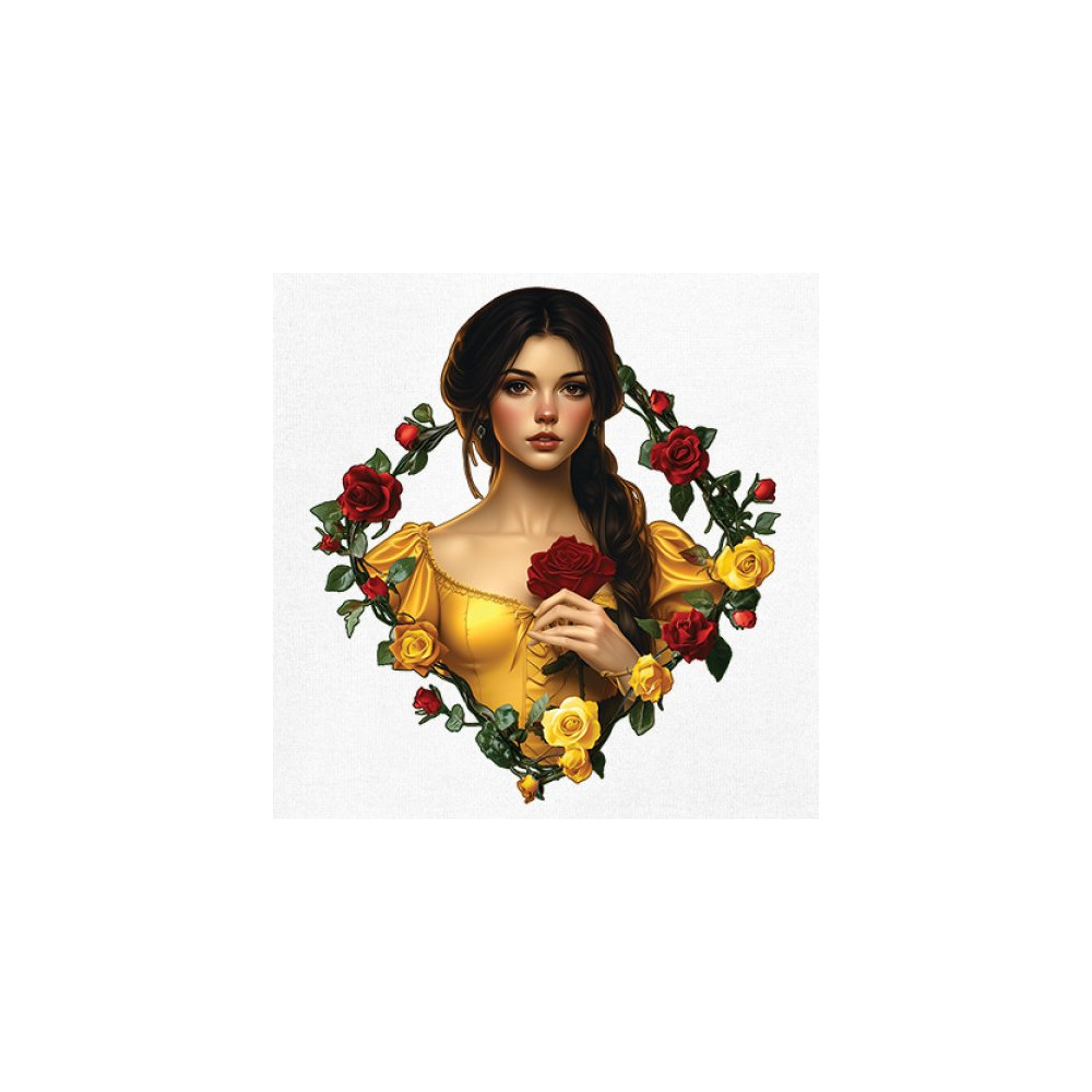 Inspired by classic fairytales, this design features a girl in a yellow gown holding a red rose, framed by rich red and yellow roses. A tribute to Beauty and the Beast, it radiates warmth, romance, and timeless fantasy. Perfect for storybook lovers, enchanted art collectors, or those drawn to magical, symbolic imagery filled with beauty and grace.