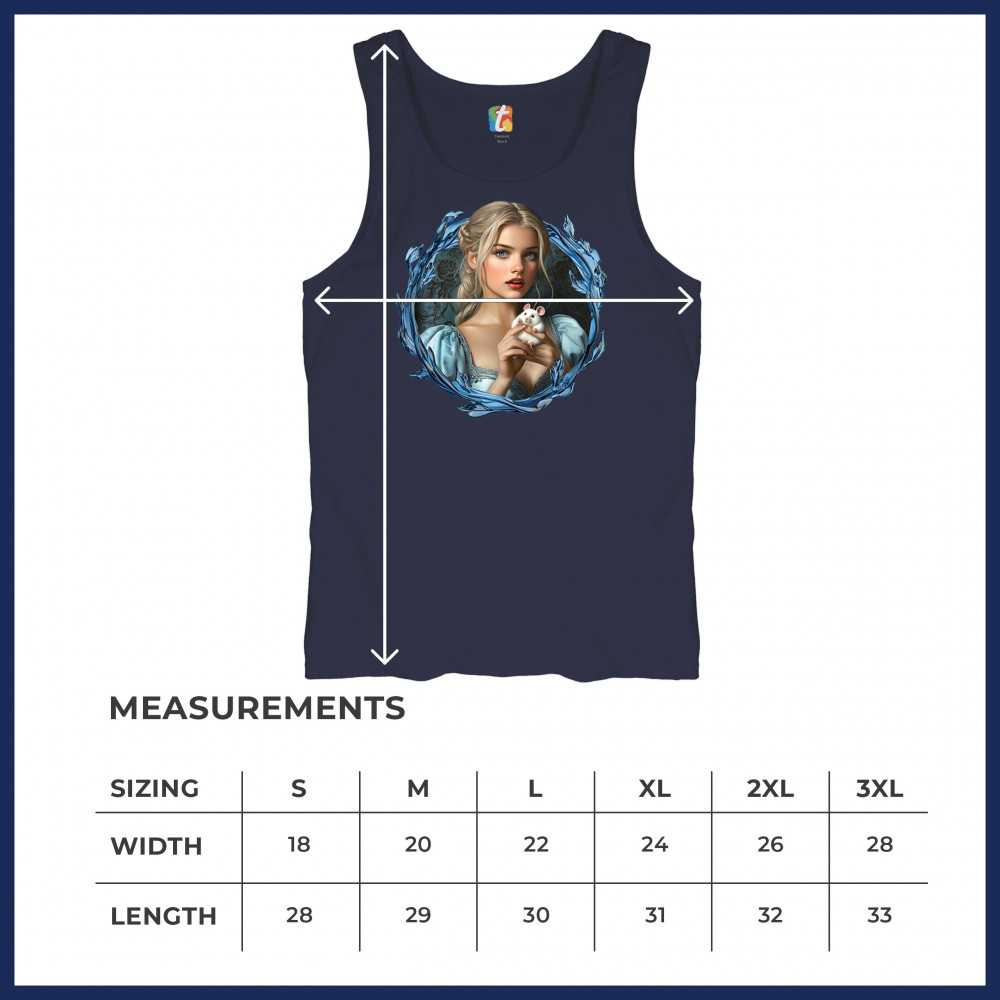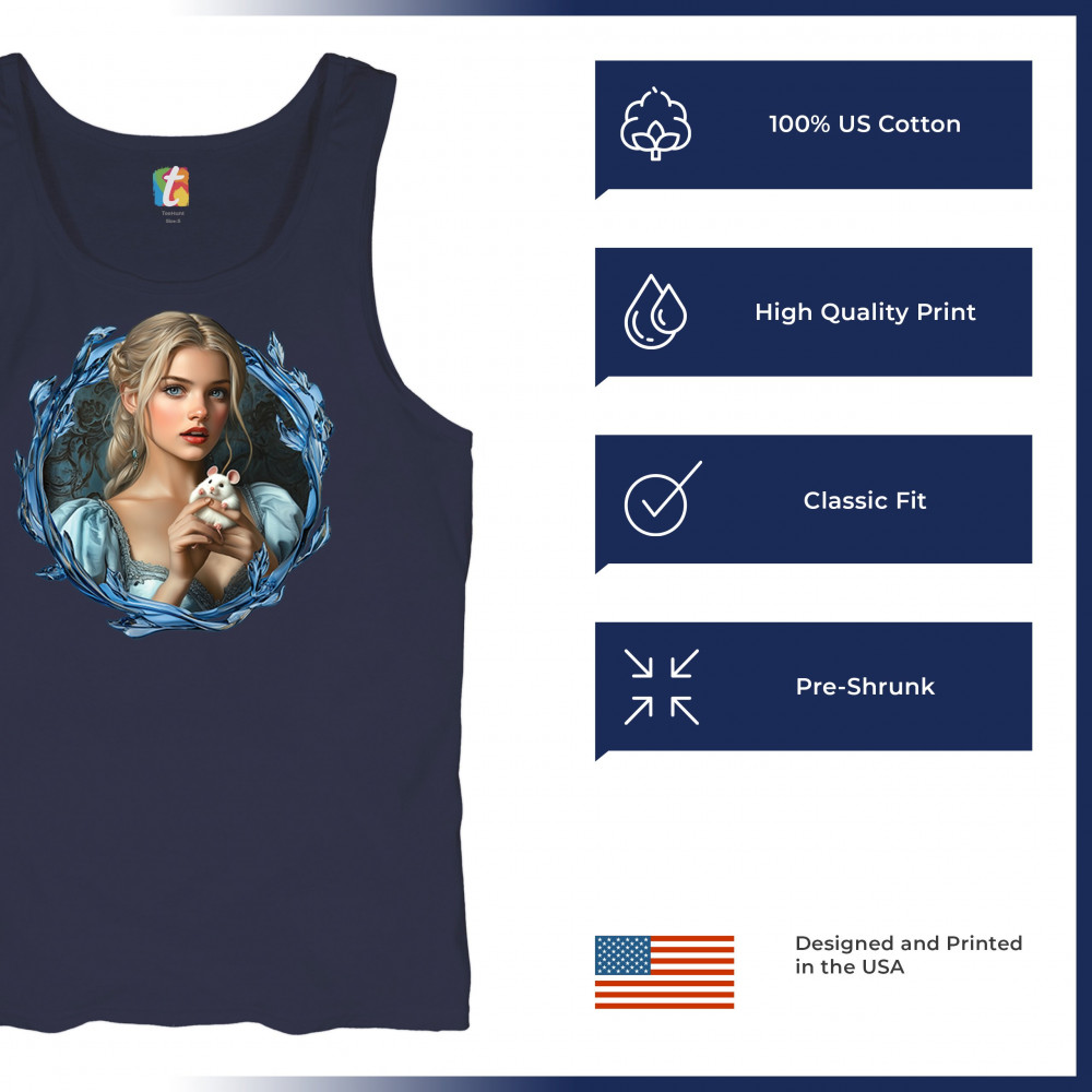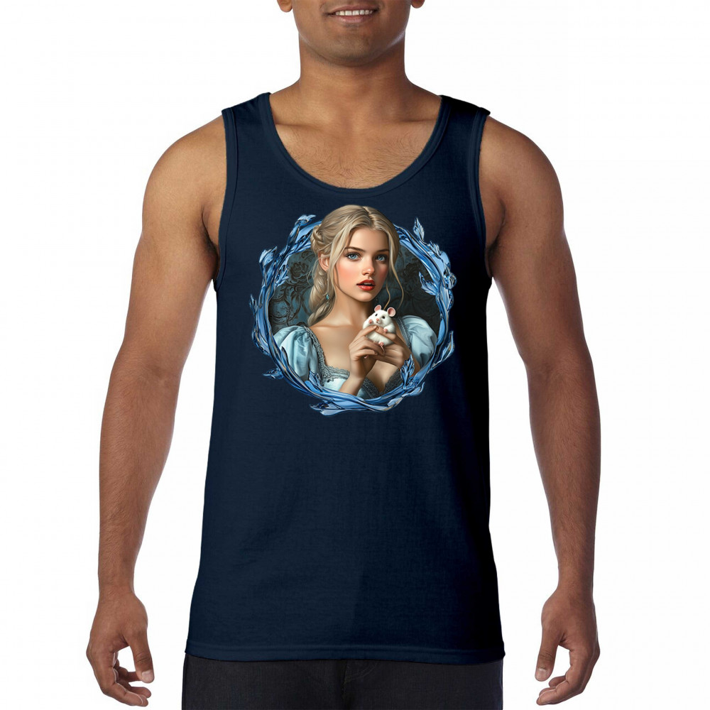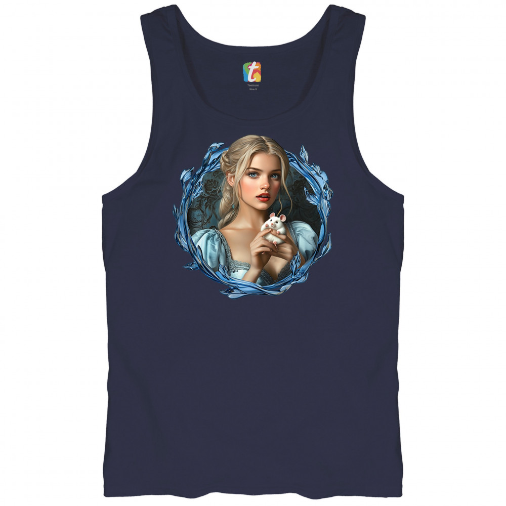 A whimsical design inspired by fairytales and Cinderella magic, featuring a blonde girl in a blue dress holding a white mouse. The icy blue leaf frame evokes enchantment and transformation. With soft, vintage tones and a dreamy feel, it’s a charming tribute to kindness, fantasy, animal companionship, and gentle storytelling magic.