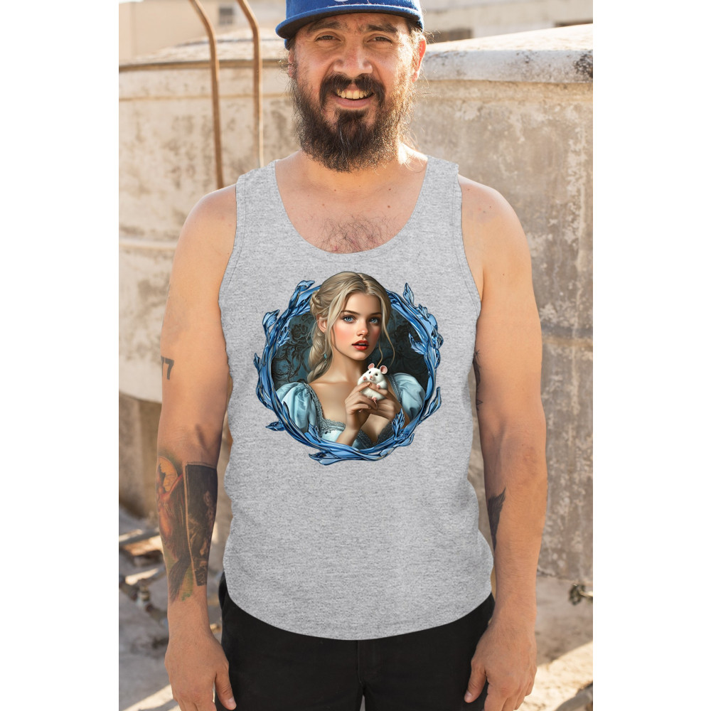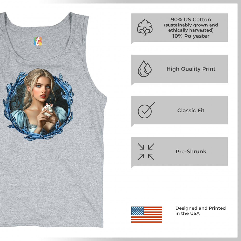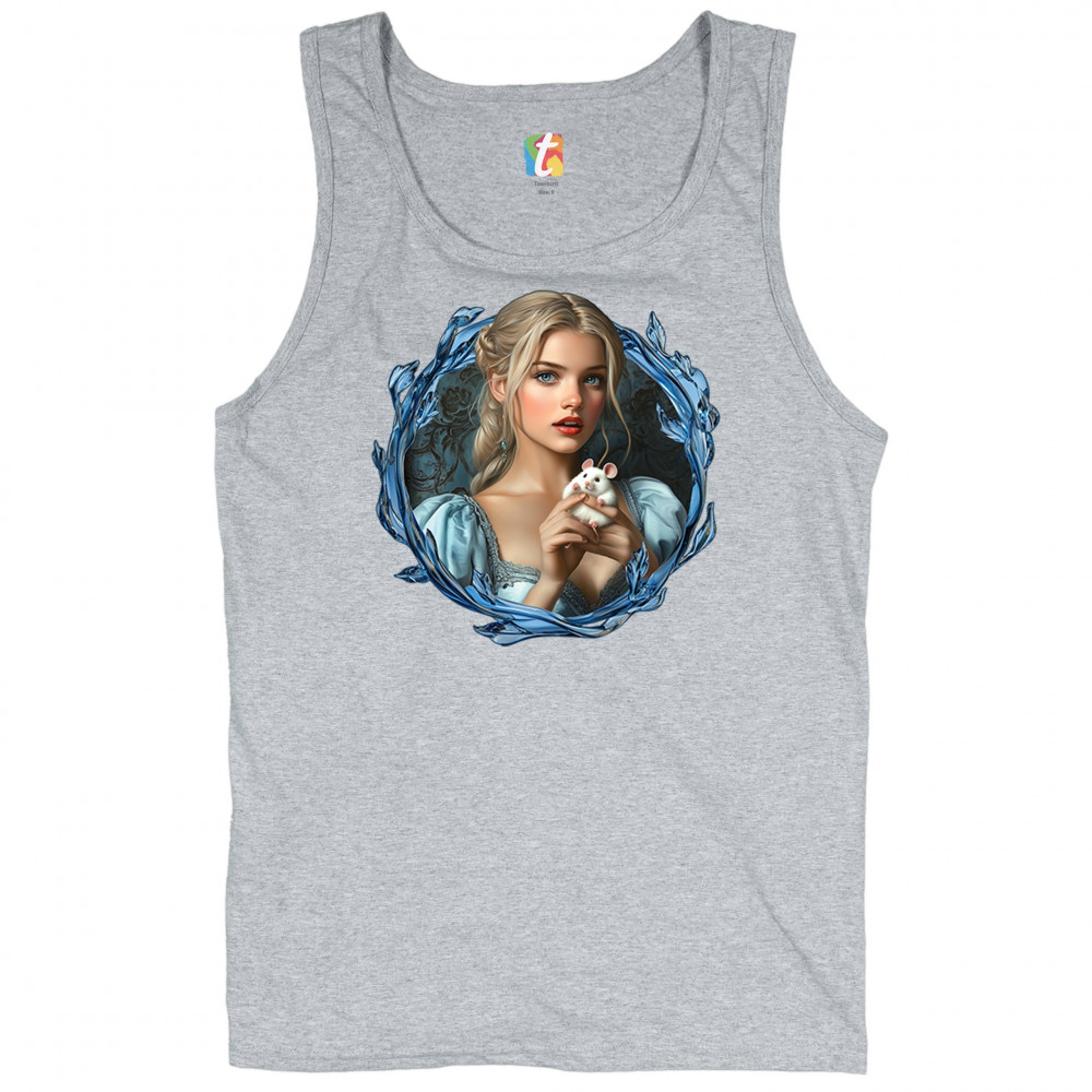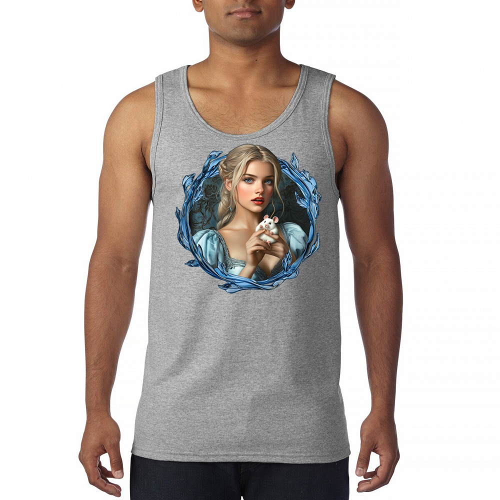 A whimsical design inspired by fairytales and Cinderella magic, featuring a blonde girl in a blue dress holding a white mouse. The icy blue leaf frame evokes enchantment and transformation. With soft, vintage tones and a dreamy feel, it’s a charming tribute to kindness, fantasy, animal companionship, and gentle storytelling magic.