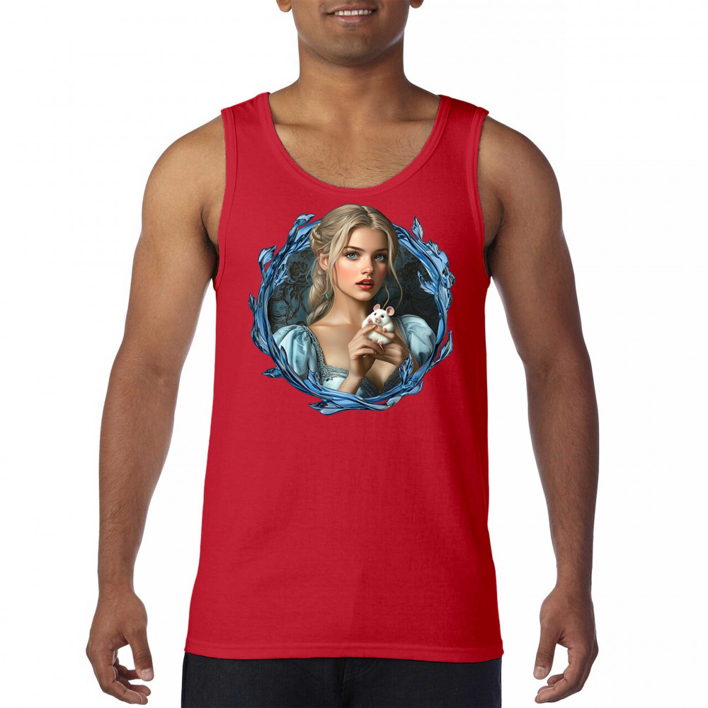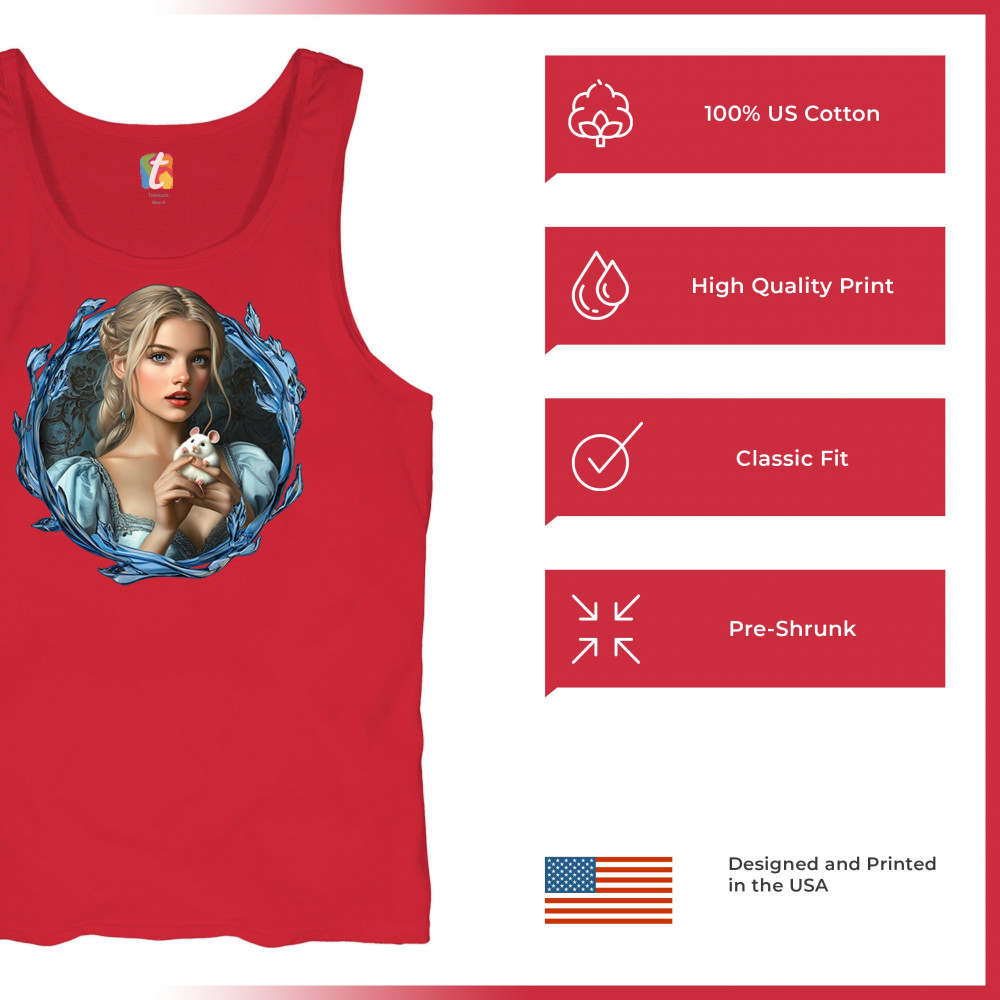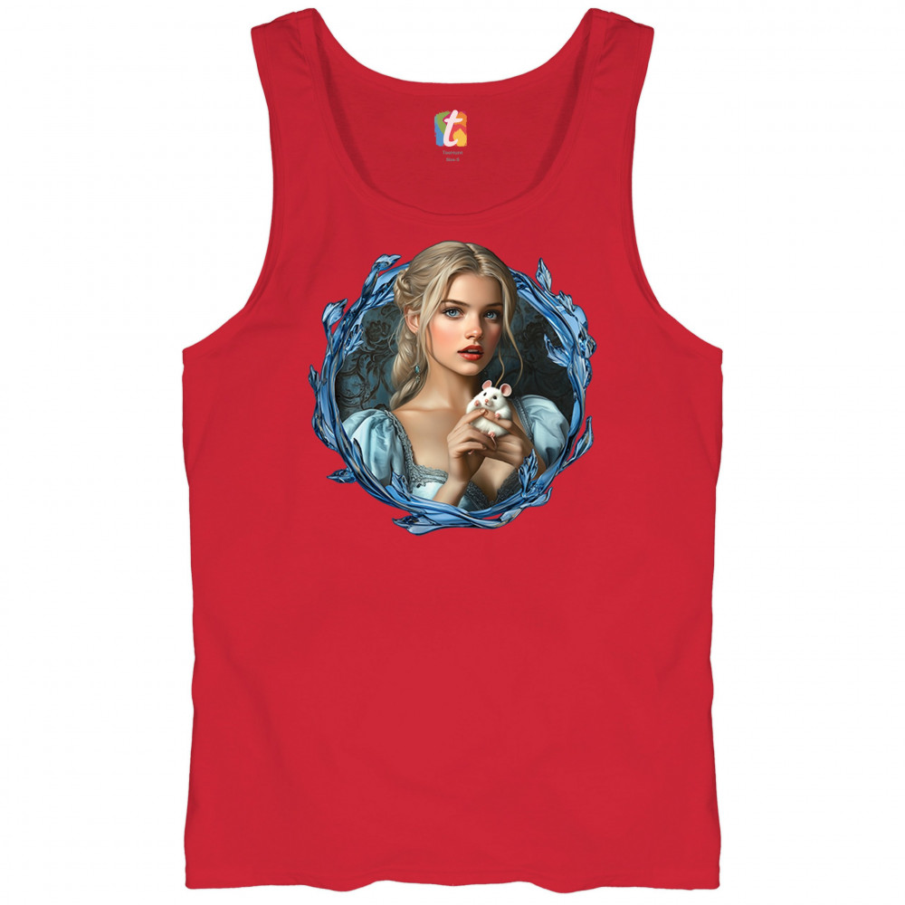 A whimsical design inspired by fairytales and Cinderella magic, featuring a blonde girl in a blue dress holding a white mouse. The icy blue leaf frame evokes enchantment and transformation. With soft, vintage tones and a dreamy feel, it’s a charming tribute to kindness, fantasy, animal companionship, and gentle storytelling magic.