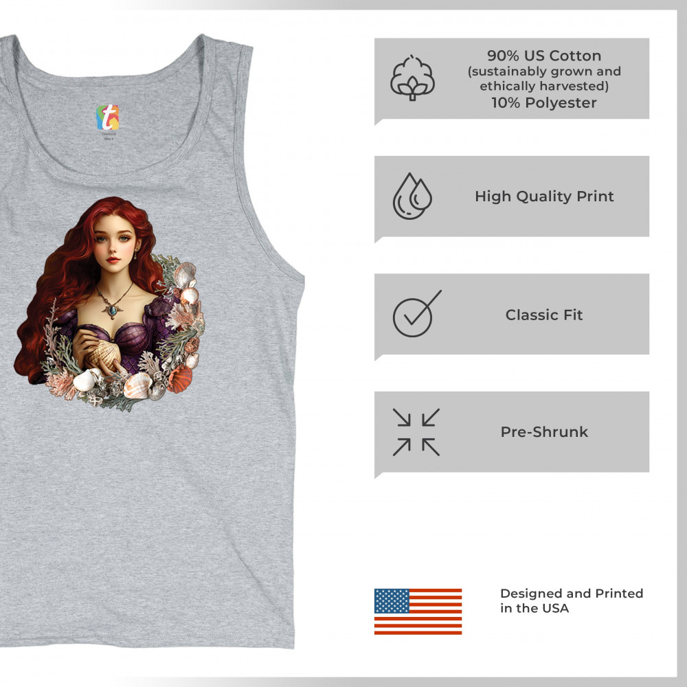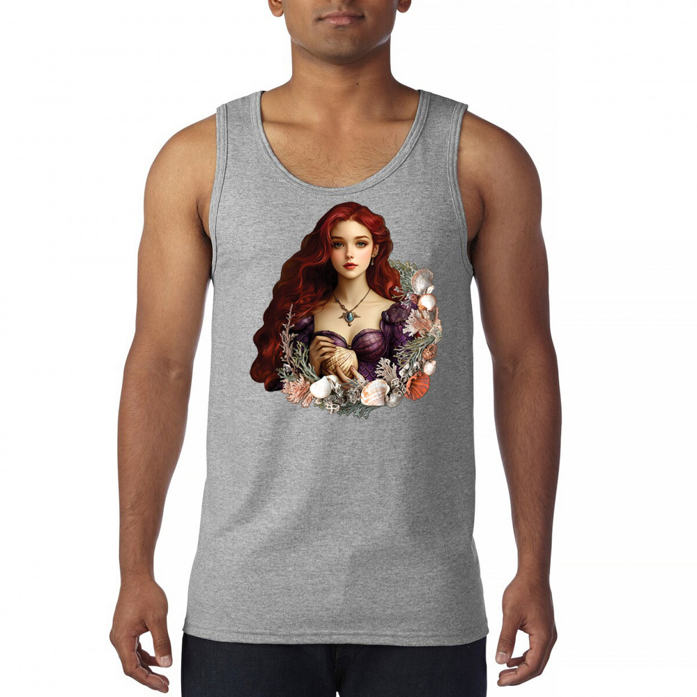 Inspired by mystical ocean themes, this design features a fantasy red-haired girl in a seashell dress, cradling a large shell. She is framed by coral, seaweed, and a shimmering array of ocean shells. With nods to classic mermaid lore and fairytale storytelling, it's perfect for fans of fantasy creatures, marine magic, and romantic ocean legends.