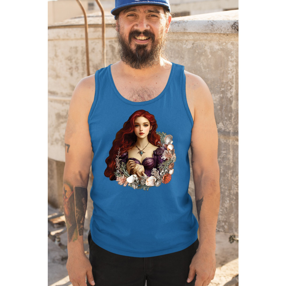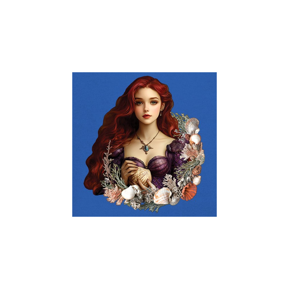 Inspired by mystical ocean themes, this design features a fantasy red-haired girl in a seashell dress, cradling a large shell. She is framed by coral, seaweed, and a shimmering array of ocean shells. With nods to classic mermaid lore and fairytale storytelling, it's perfect for fans of fantasy creatures, marine magic, and romantic ocean legends.