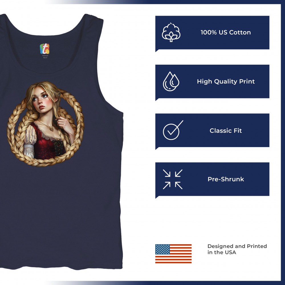 A dreamy design featuring a blonde girl with long braided hair encircling her like a frame. With vintage dress details and a wistful look, this artwork channels the essence of fairytales, romantic legends, and gentle feminine power. Ideal for fantasy lovers, folklore fans, and collectors of magical storybook themes.