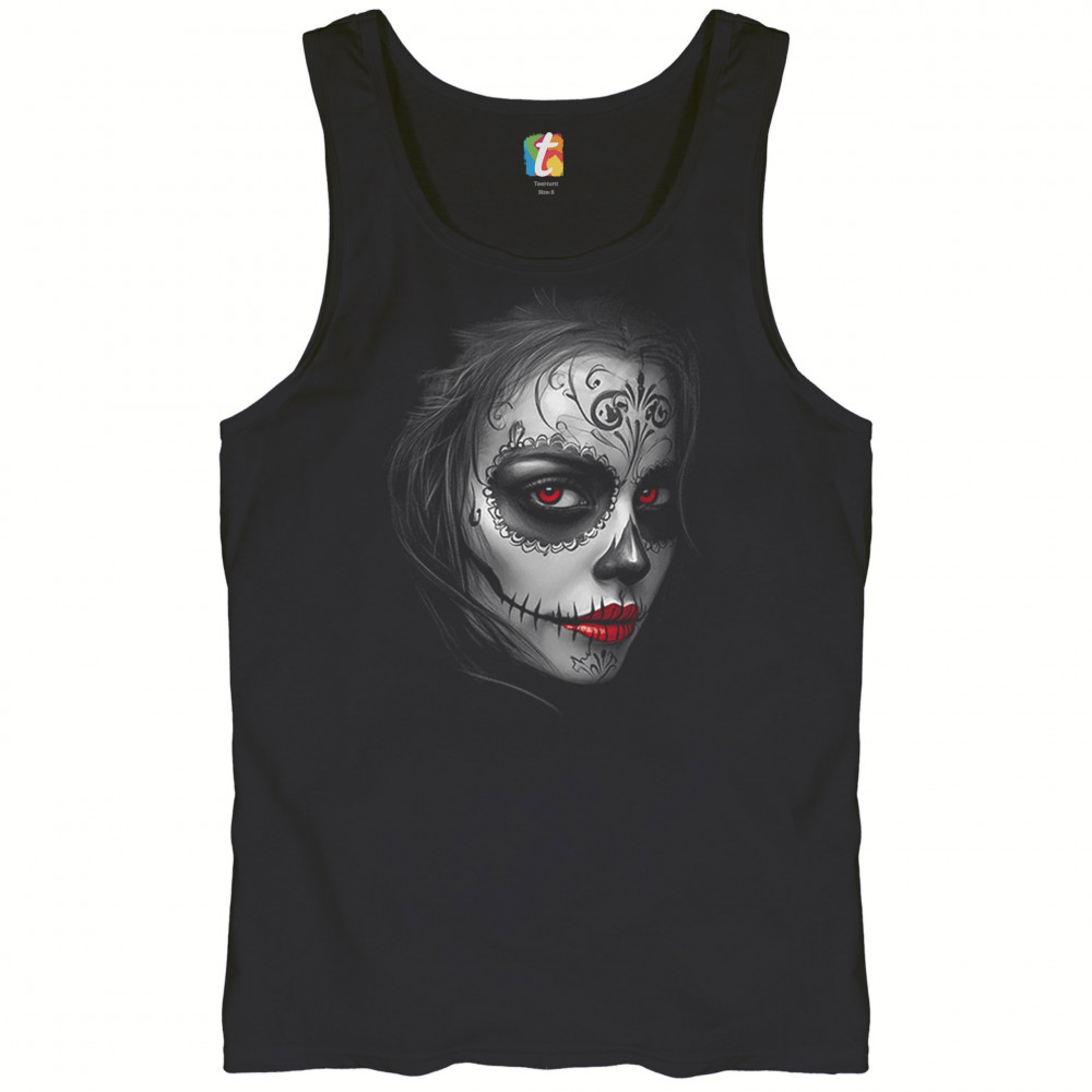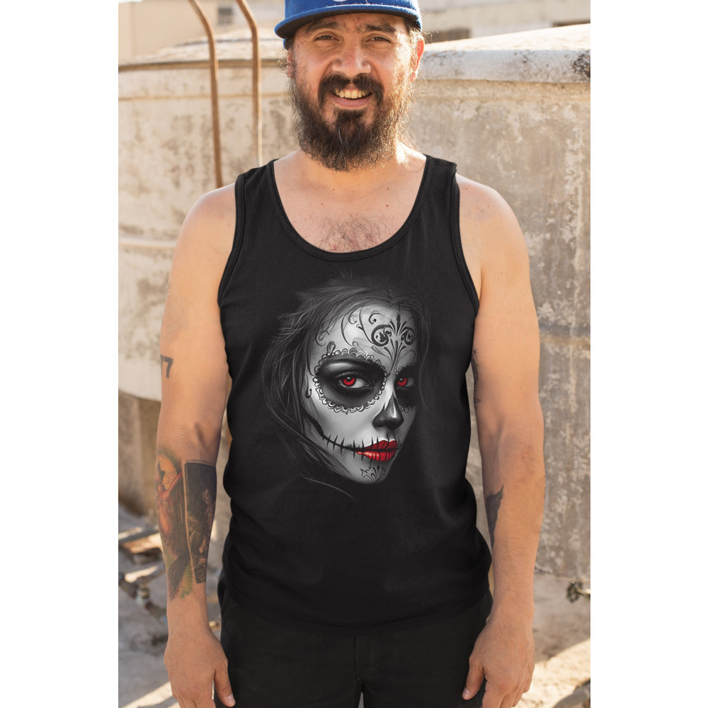 Glowing red eyes and red lips bring this sugar skull design to life. Featuring floral skull makeup, dark shadows, and gothic energy, it's a perfect pick for Halloween, DÃa de los Muertos, or alt culture fashion. Ideal for fans of bold beauty, spooky glamour, and skull art with an edge.
