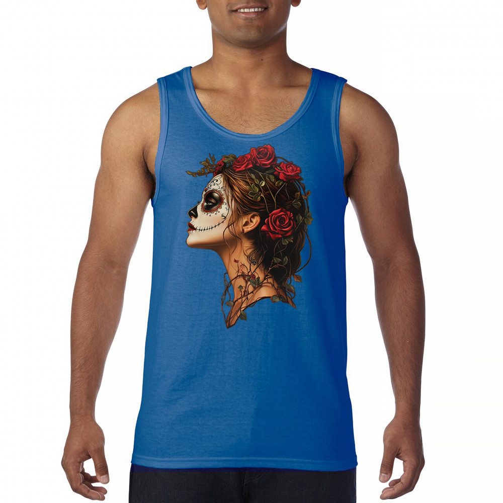 Celebrate feminine power and gothic elegance with this captivating DÃa de los Muertos design. Featuring a woman in profile with sugar skull makeup, blooming red roses, natural vines, dark hair, and symbolic floral skull art, this bold tribute captures beauty, death, and strength in one romantic, detailed visual.