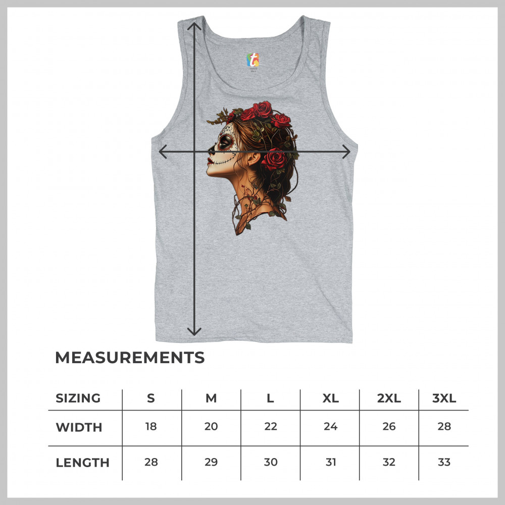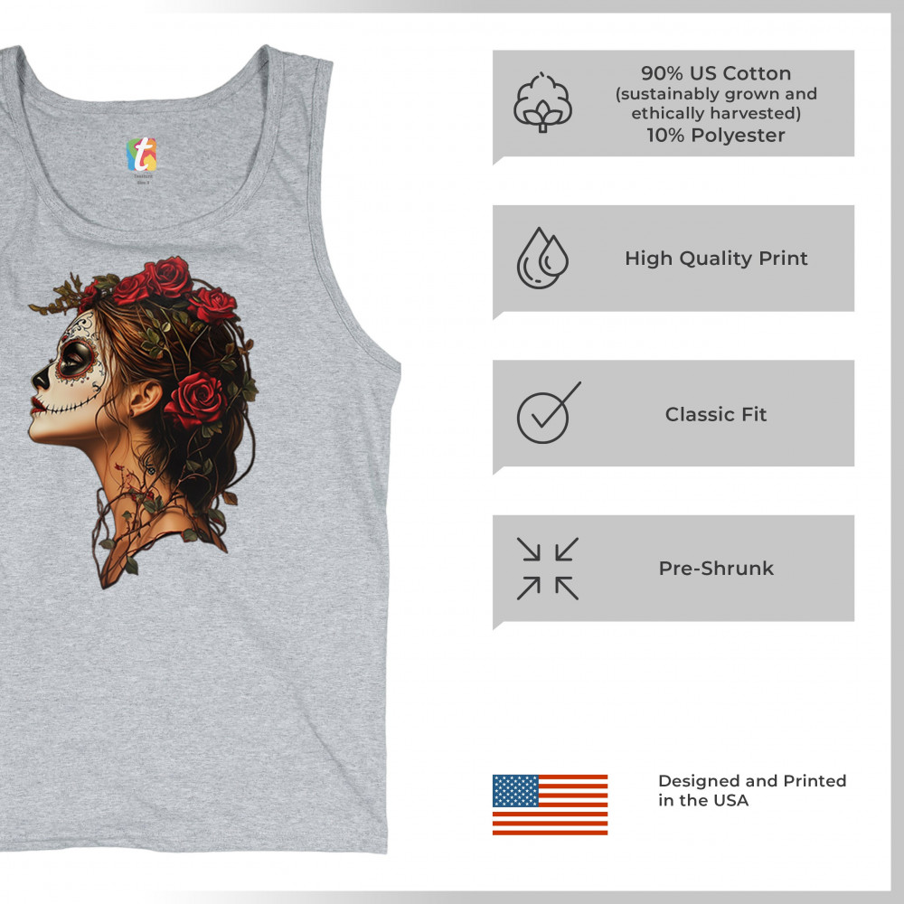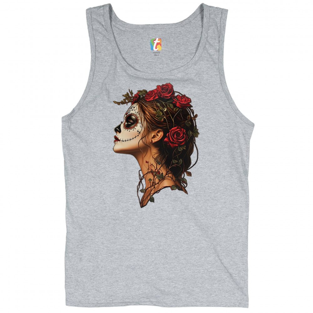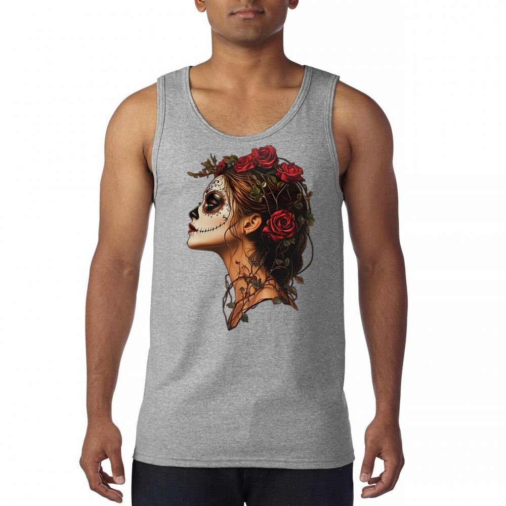 Celebrate feminine power and gothic elegance with this captivating DÃa de los Muertos design. Featuring a woman in profile with sugar skull makeup, blooming red roses, natural vines, dark hair, and symbolic floral skull art, this bold tribute captures beauty, death, and strength in one romantic, detailed visual.