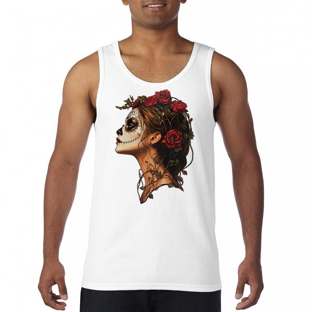 Celebrate feminine power and gothic elegance with this captivating DÃa de los Muertos design. Featuring a woman in profile with sugar skull makeup, blooming red roses, natural vines, dark hair, and symbolic floral skull art, this bold tribute captures beauty, death, and strength in one romantic, detailed visual.