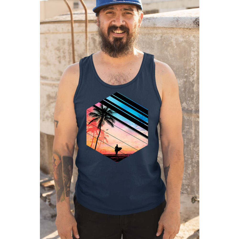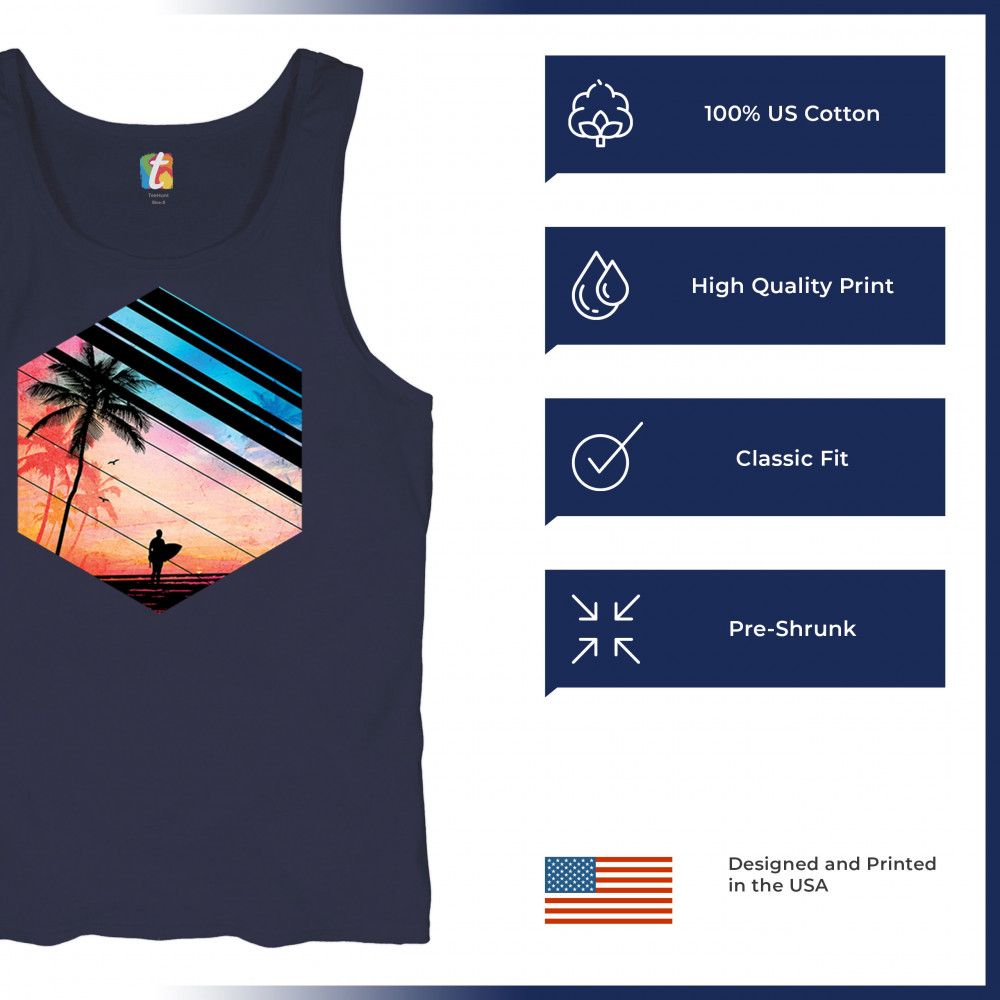 Catch the vibe of endless summer with our surf-inspired tee. Featuring silhouetted palms, warm gradients, and cool geometric shapes, it’s a visual journey from the urban grind to tropical tranquility. This tee is for the soul surfers and dreamers, made to be as enduring as the memories of your last wave. It's more than apparel—it’s a horizon of possibilities. Add this staple to your collection and let the good times roll.