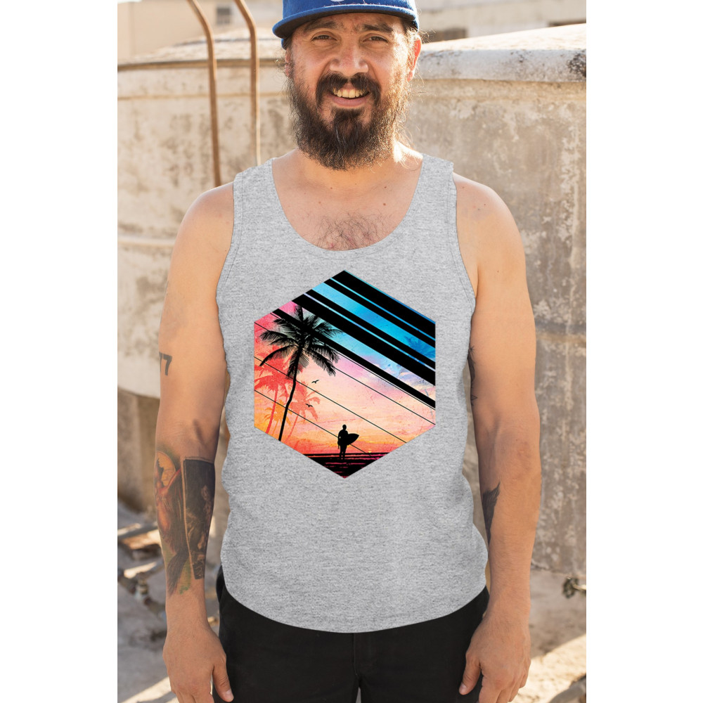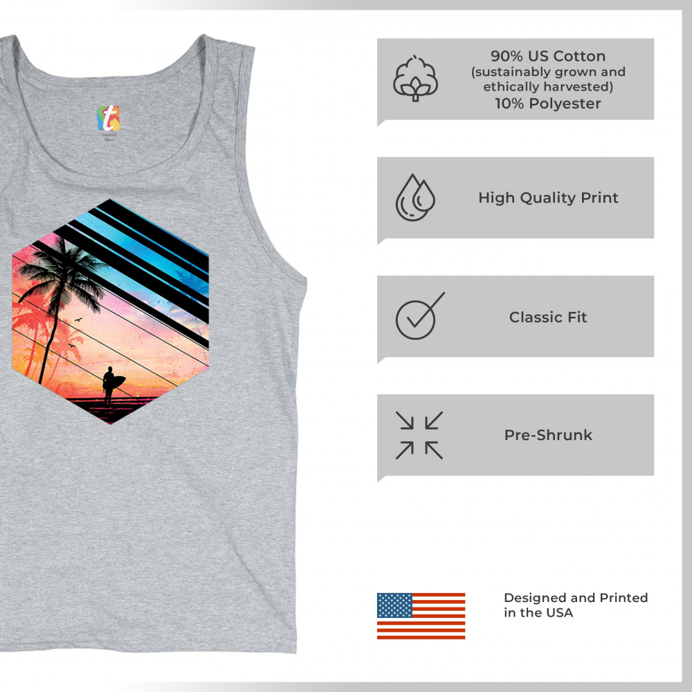 Catch the vibe of endless summer with our surf-inspired tee. Featuring silhouetted palms, warm gradients, and cool geometric shapes, it’s a visual journey from the urban grind to tropical tranquility. This tee is for the soul surfers and dreamers, made to be as enduring as the memories of your last wave. It's more than apparel—it’s a horizon of possibilities. Add this staple to your collection and let the good times roll.