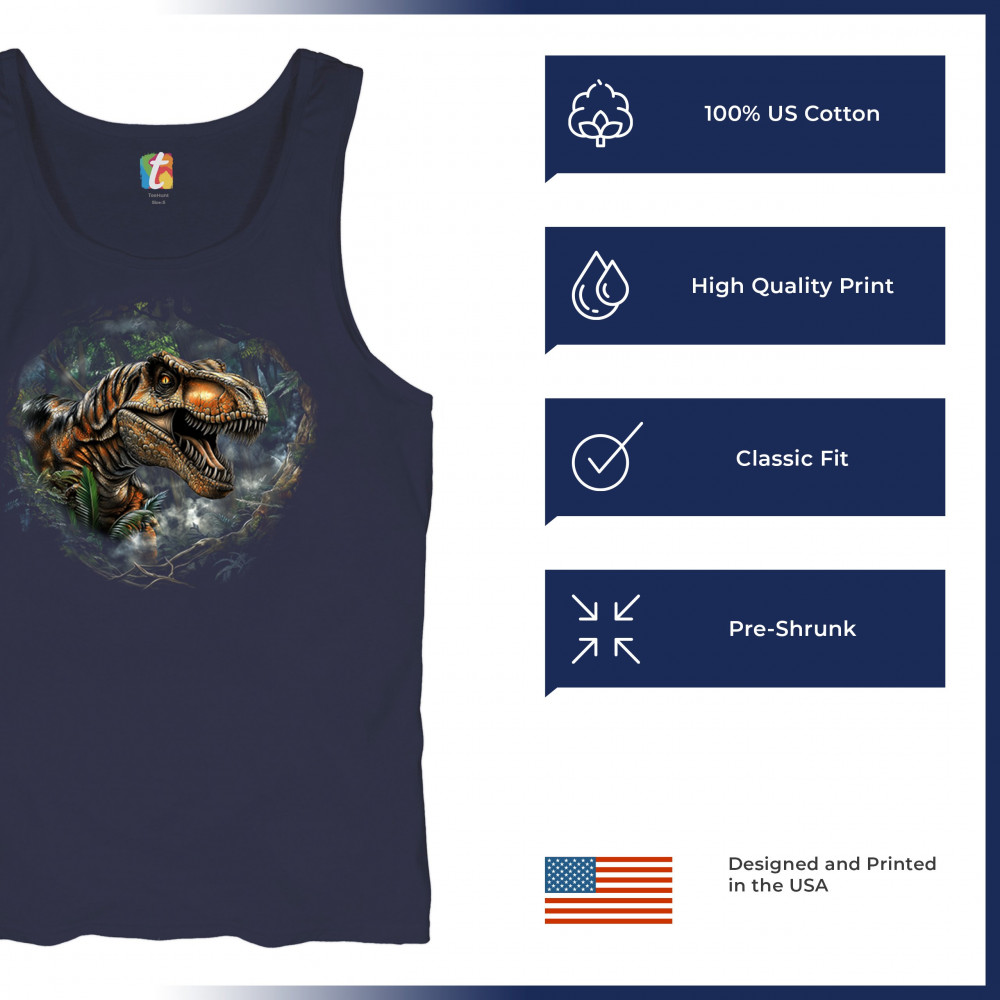 Roaring t rex in misty jungle. Great for fossil fans, dinosaur lovers, Jurassic park goers, and prehistoric adventure seekers.