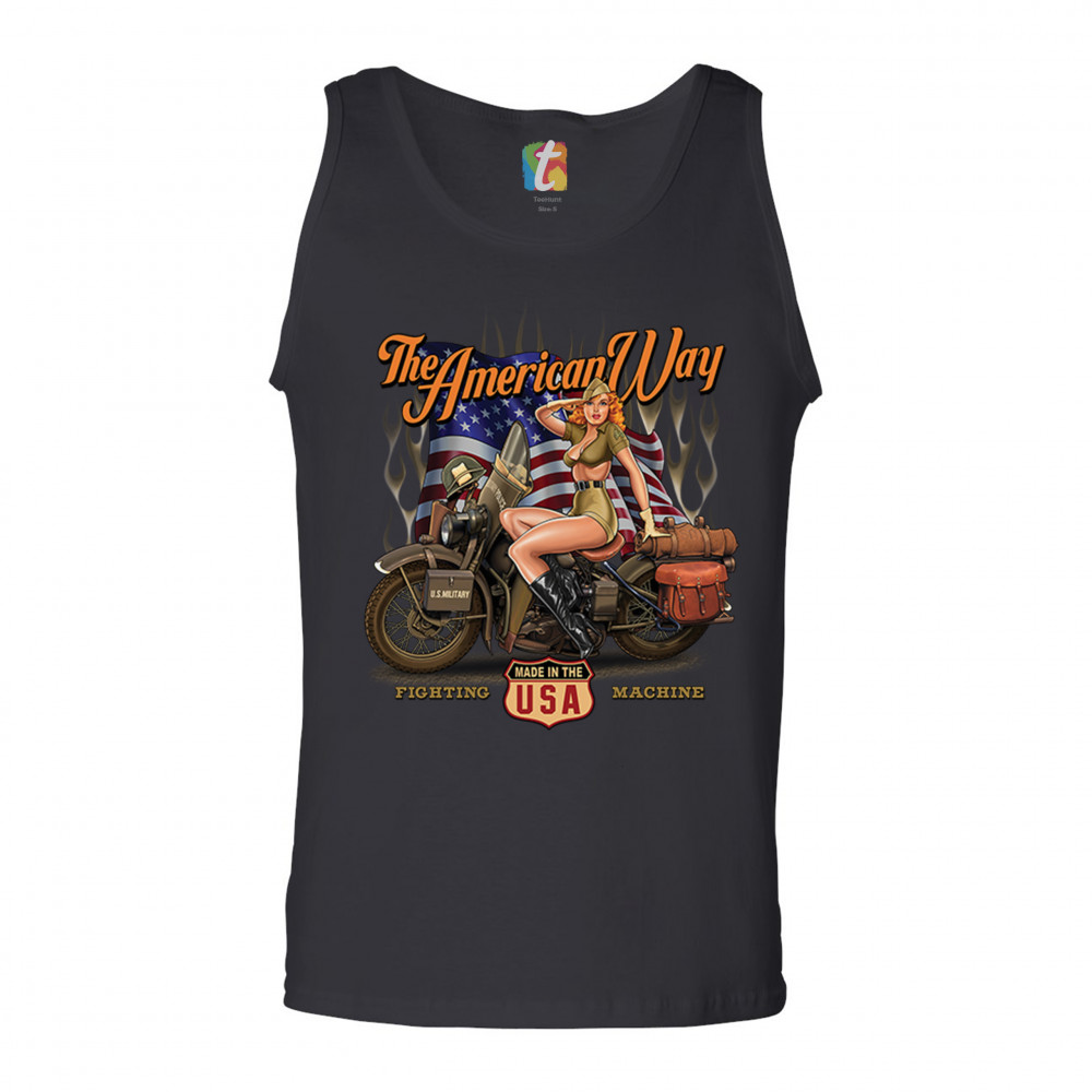 A print featuring a beautiful pin-up girl in leather boots sitting on a U.S. military motorcycle. There is the American Flag in the background and the words "The American Way" above it. At the bottom of the picture there is a shield which says: "made in the USA". "Fighting Machine" is written under the motorcycle's wheels. A great choice for a motorcycle enthusiast.
