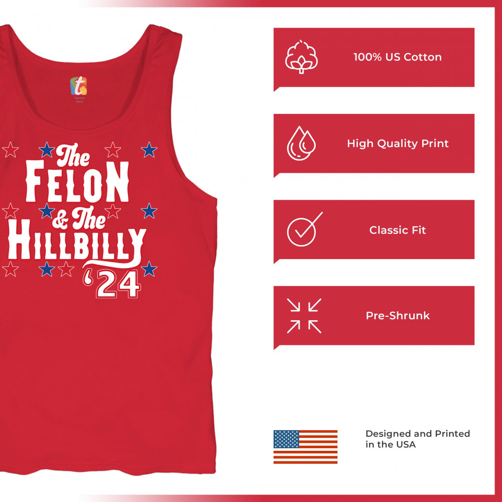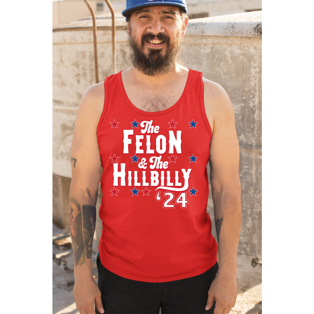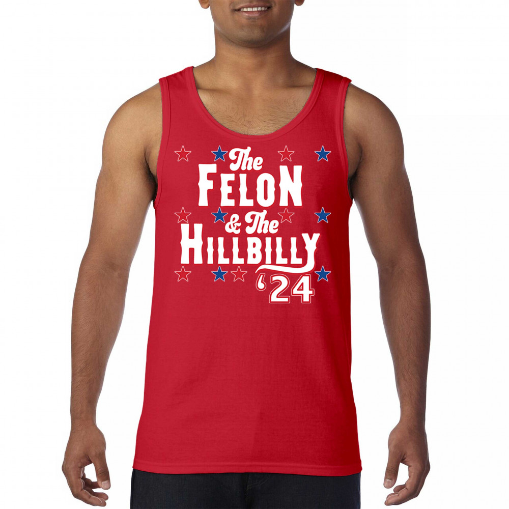 Humorous pro-Trump and Vance design for the 2024 election. "The Felon & The Hillbilly '24" captures conservative pride and humor in one bold statement.