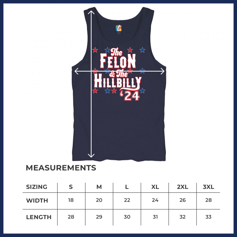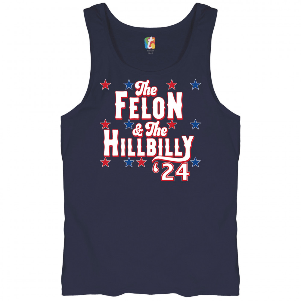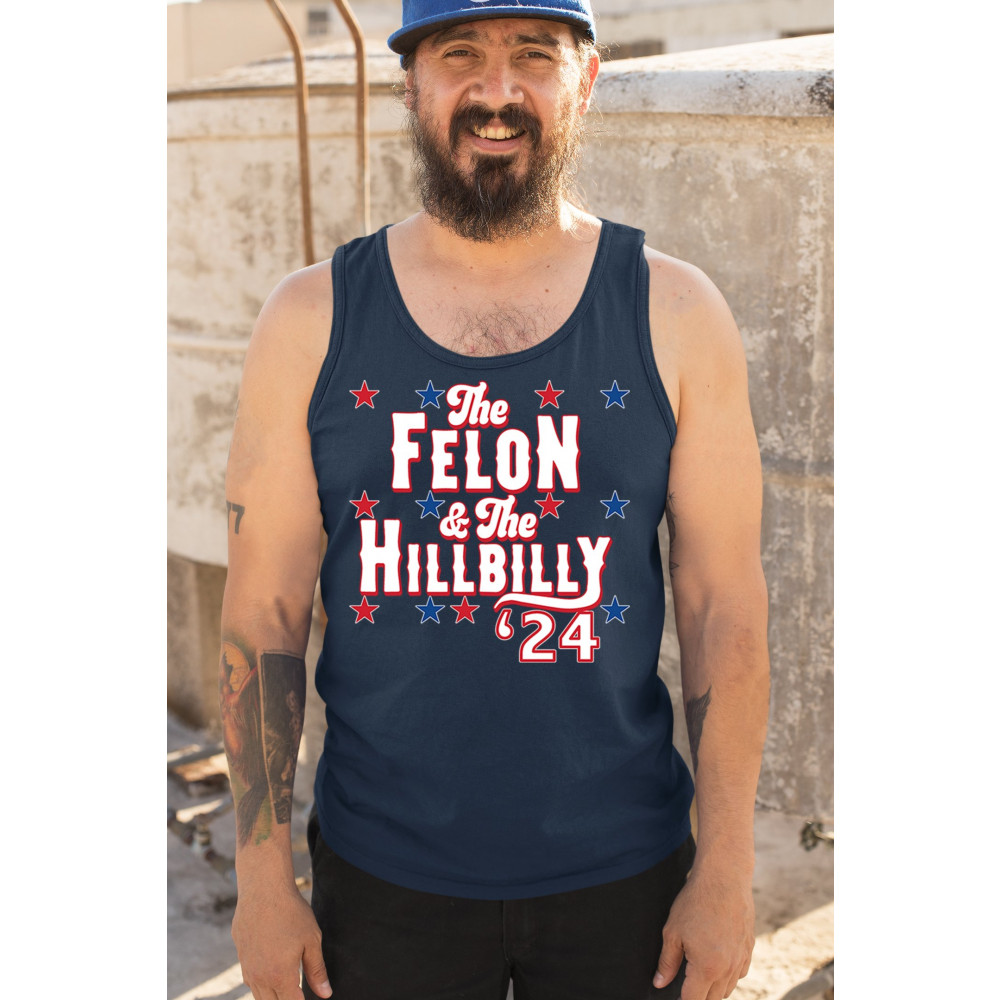 Humorous pro-Trump and Vance design for the 2024 election. "The Felon & The Hillbilly '24" captures conservative pride and humor in one bold statement.