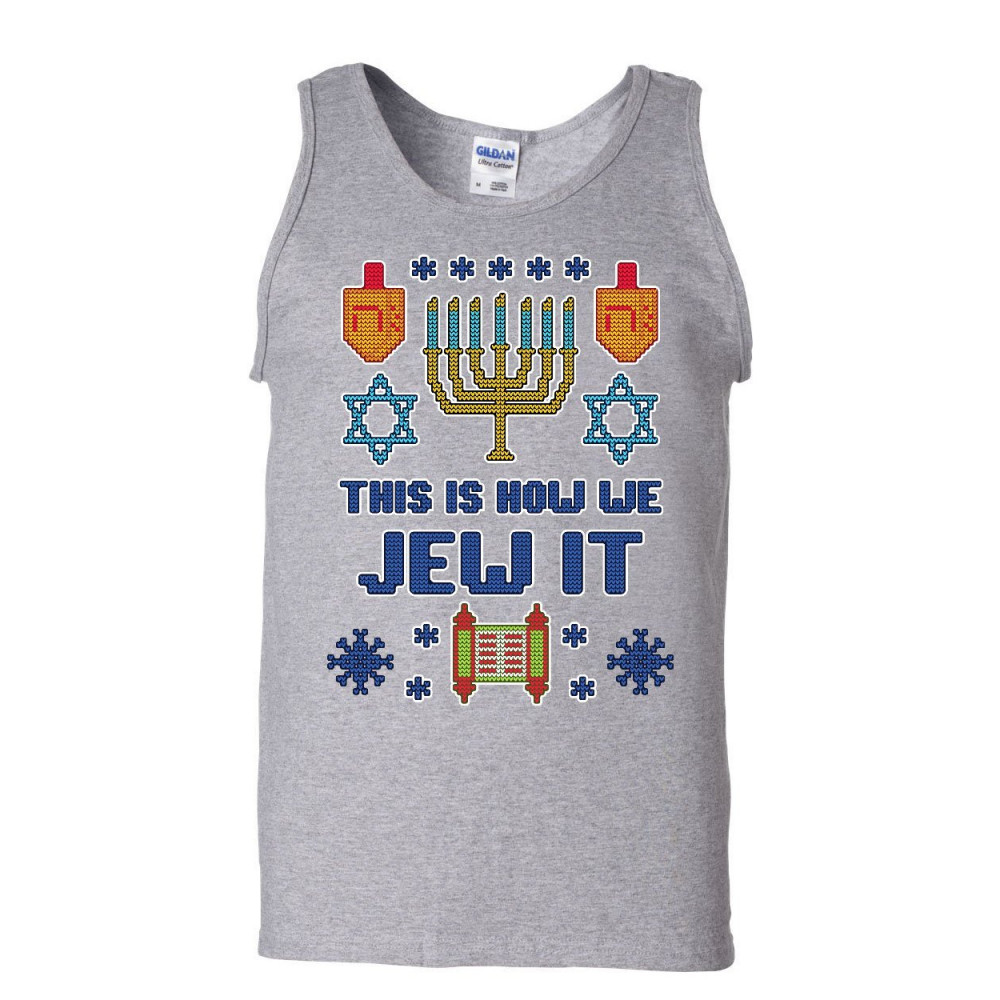 THIS IS HOW WE JEW IT UGLY SWEATER this is how we jew it ugly tank top hannukah torah menorah funny sleeveless gray