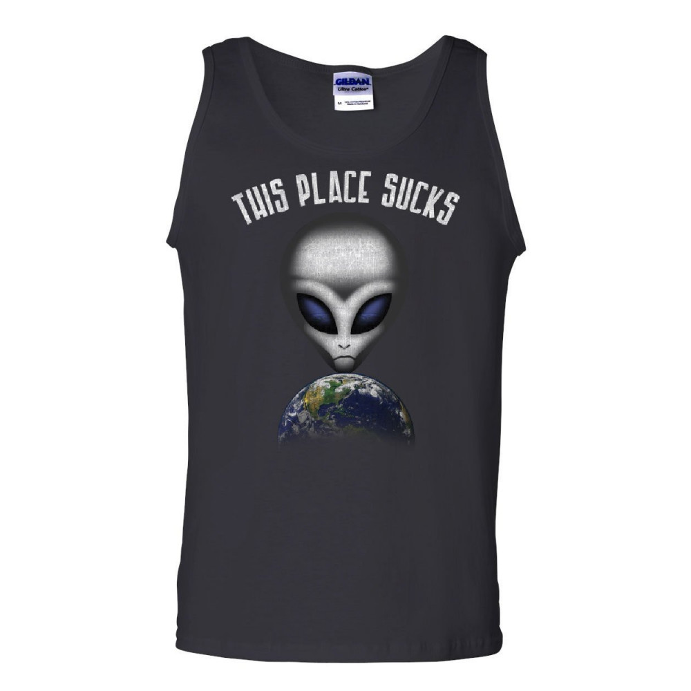 THIS PLACE SUCKS tank top funny ufo alien space universe earth sleeveless black