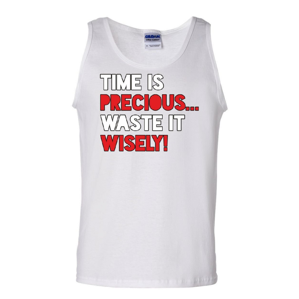 TIME IS PRECIOUS WASTE IT WISELY! time is precious waste it wisely tank top college humor lazy fun sleeveless white