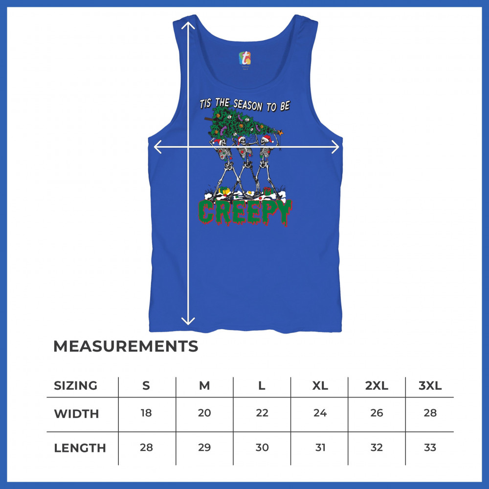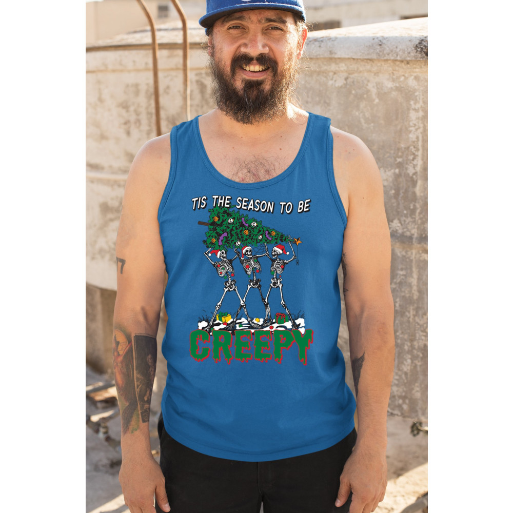 "Tis the Season to Be Creepy" combines holiday cheer with a hauntingly fun twist. This creative design features skeletons donning Santa hats as they carry a spooky Christmas tree decorated with eerie ornaments. Perfect for holiday gatherings, Secret Santa gifts, or themed parties, this design celebrates the festive and the macabre. Embrace the jolliest and creepiest bunch this season with this standout apparel.