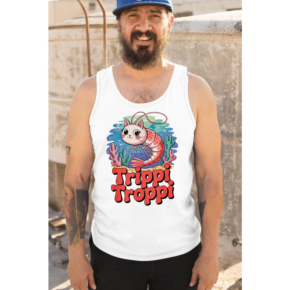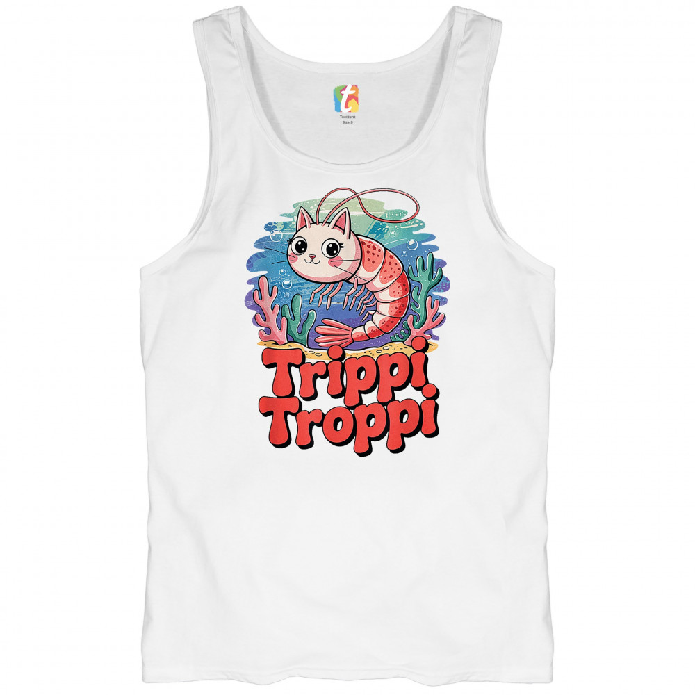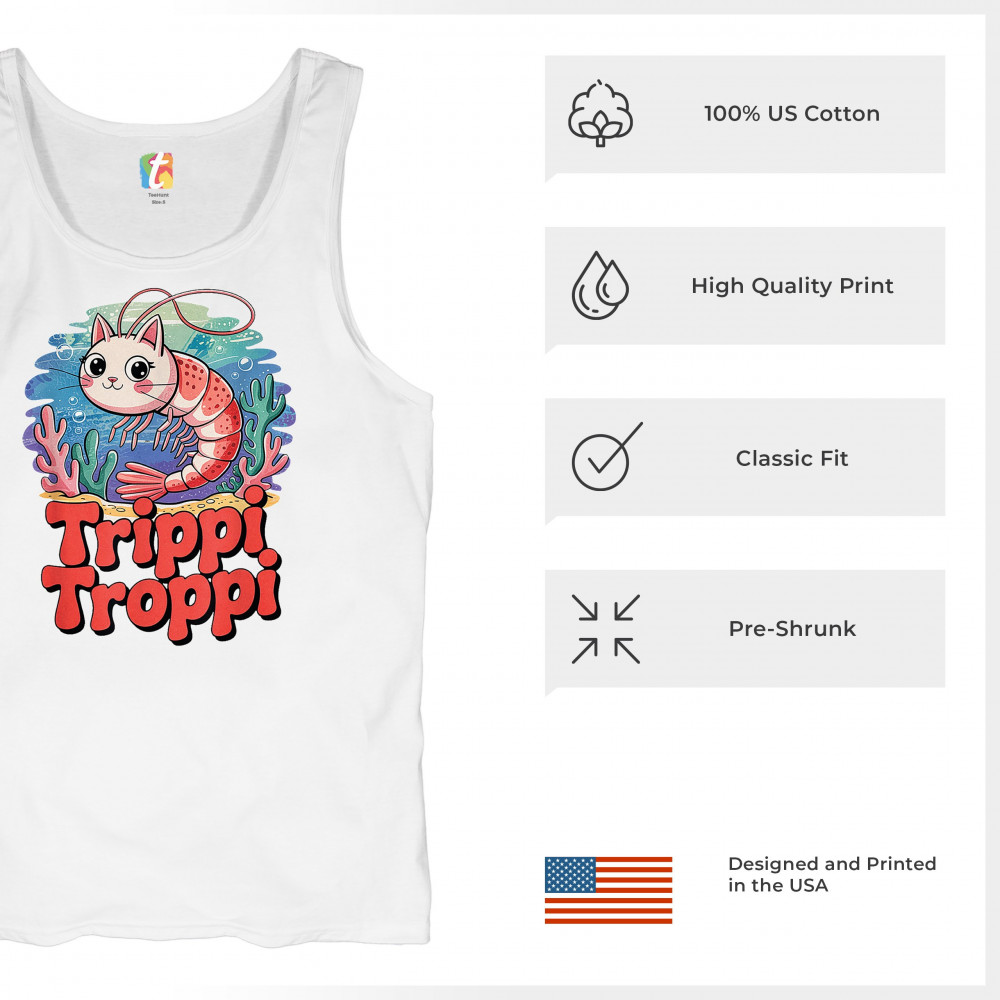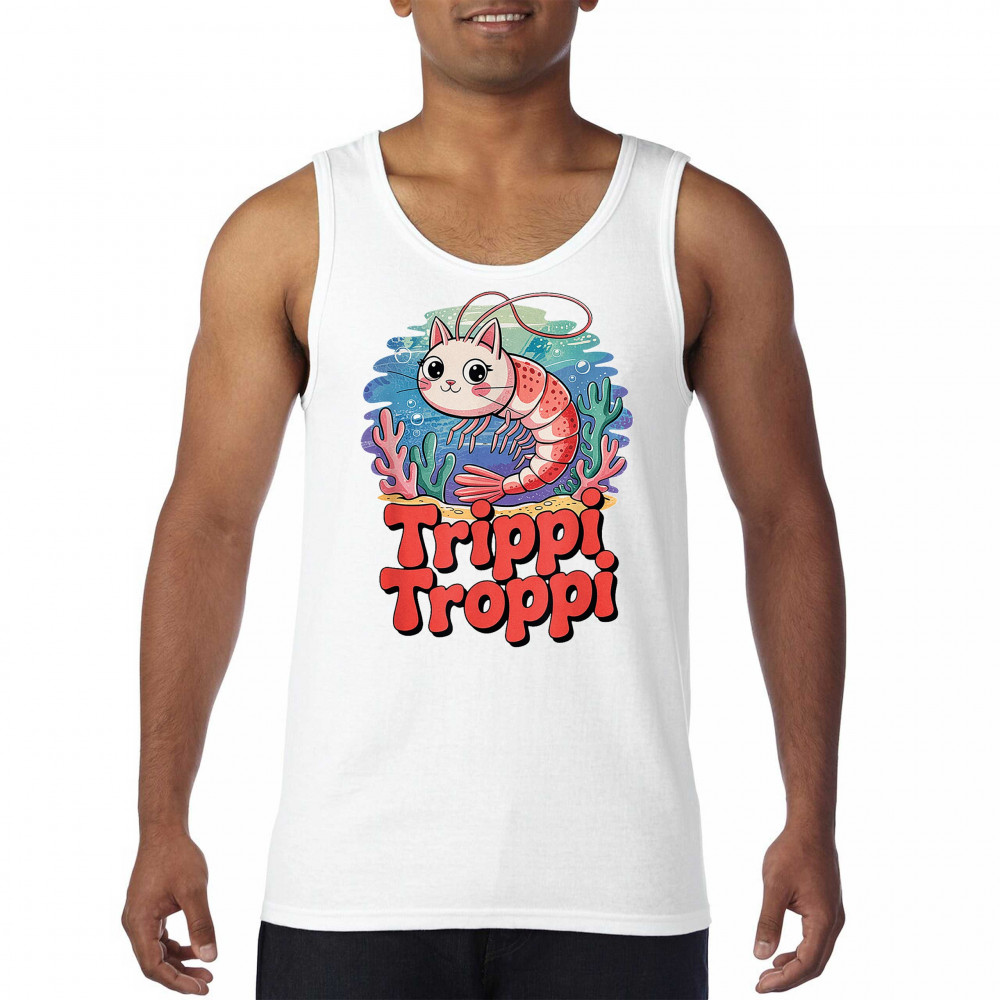 Dive deep into absurdity with Trippi Troppi—a surreal shrimp-cat fusion straight out of Italian Brainrot territory. This design captures cursed animal chaos, weirdcore visuals, TikTok meme culture, and underwater fever dream aesthetics. Made for Gen Z humor addicts, ocean meme fans, and ironic fashion lovers alike.