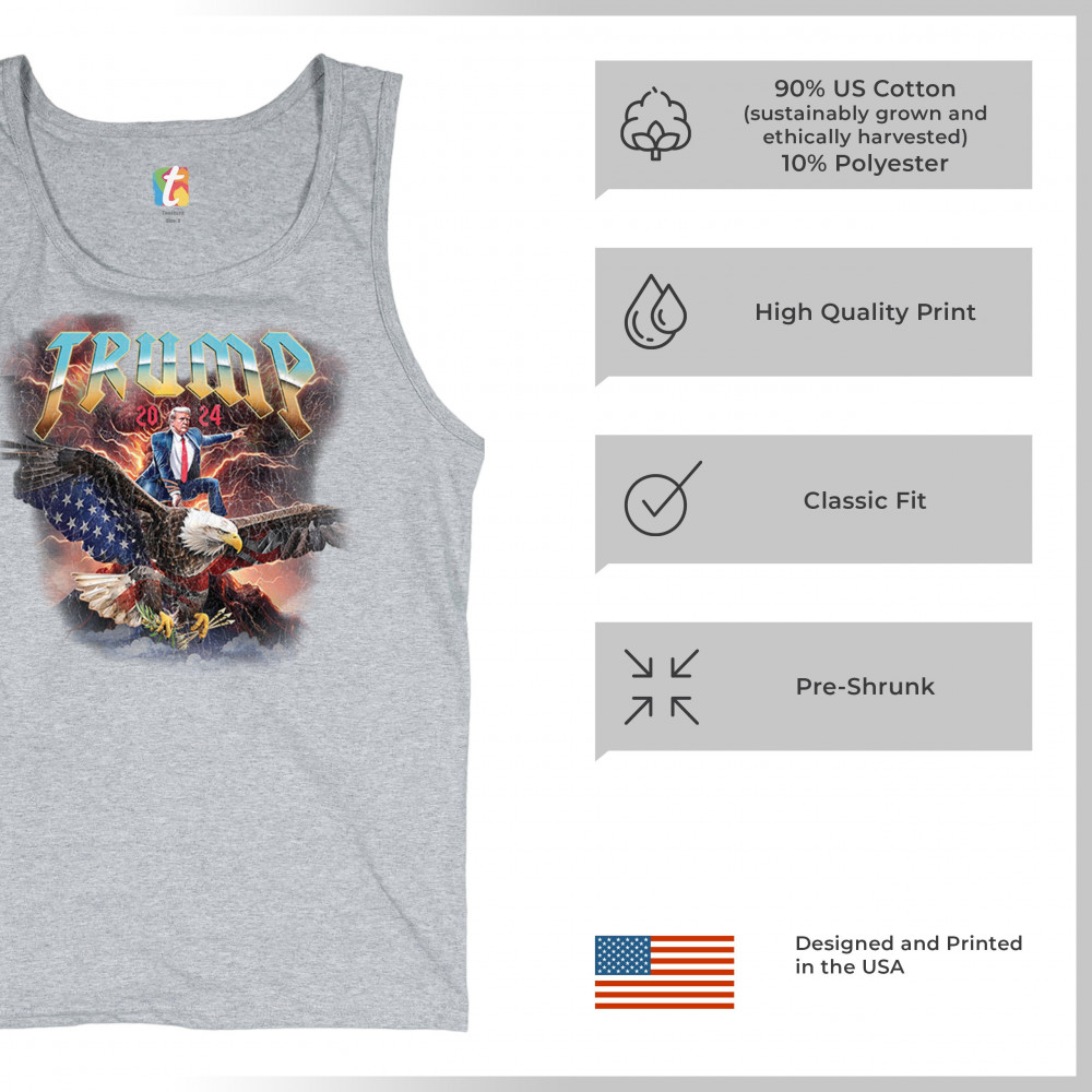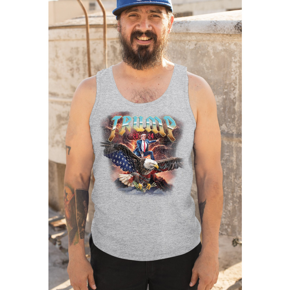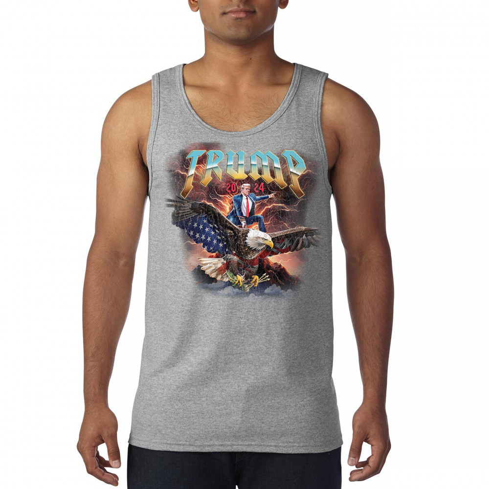Stand out with our "Trump 2024" design featuring Trump riding an eagle. Perfect for rallies and patriotic events. Show your support with pride and confidence.