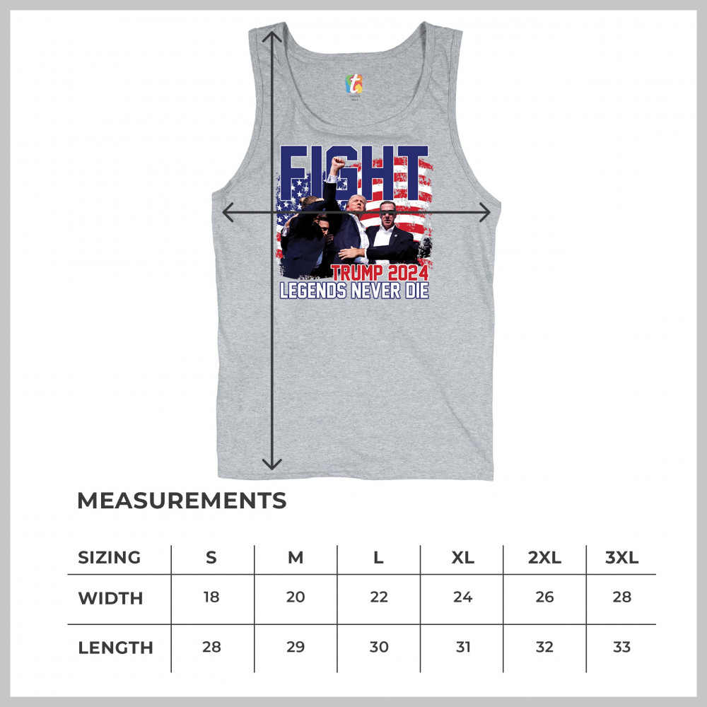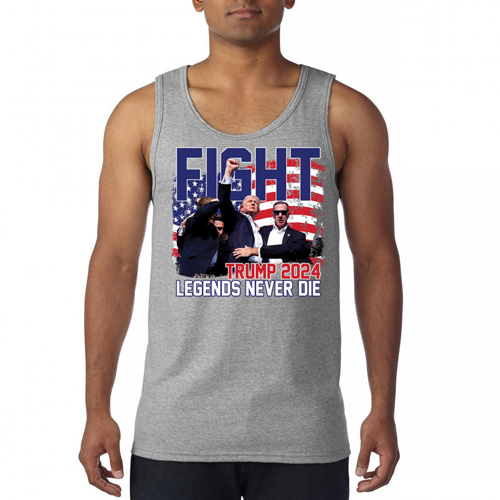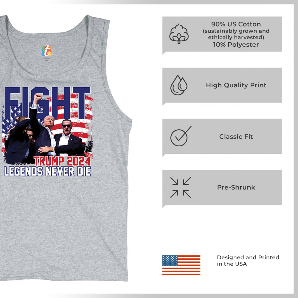 Show your Trump 2024 support with our bold "Fight" design, featuring "Legends Never Die" and a patriotic American flag. Perfect for rallies and everyday wear.