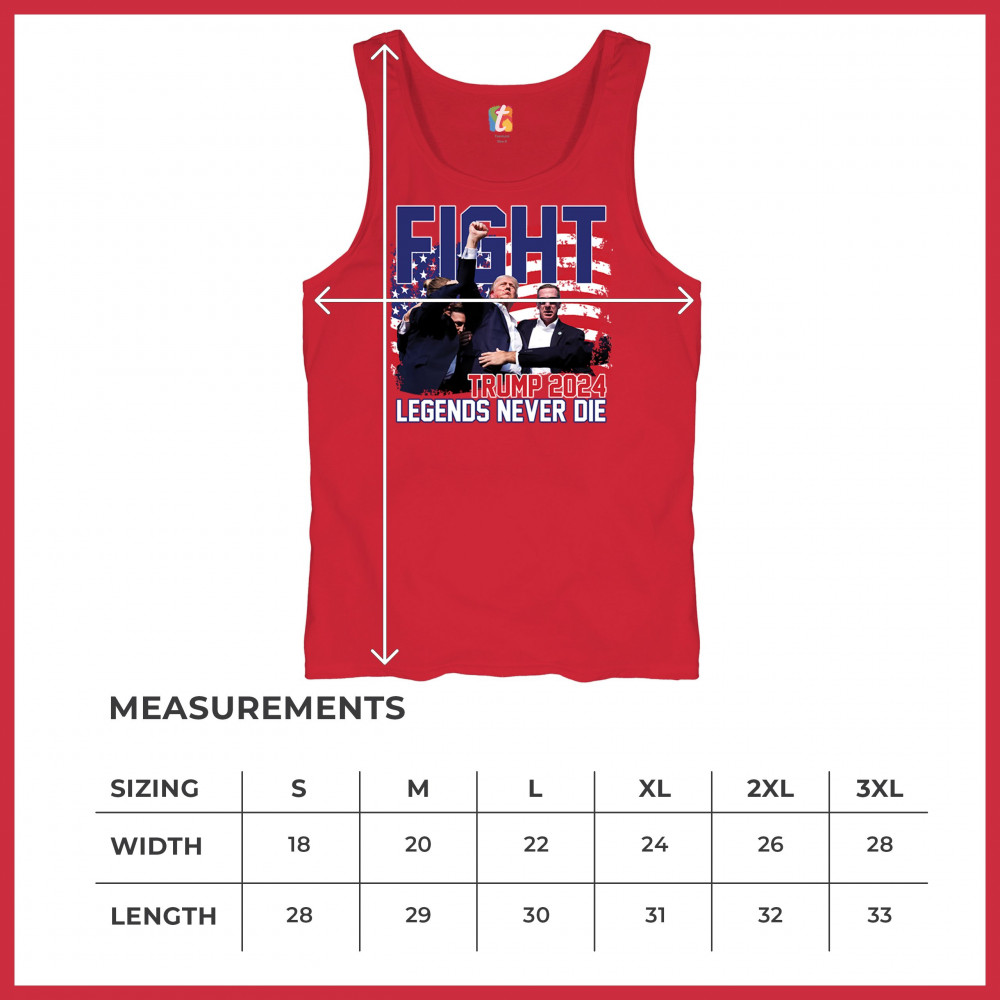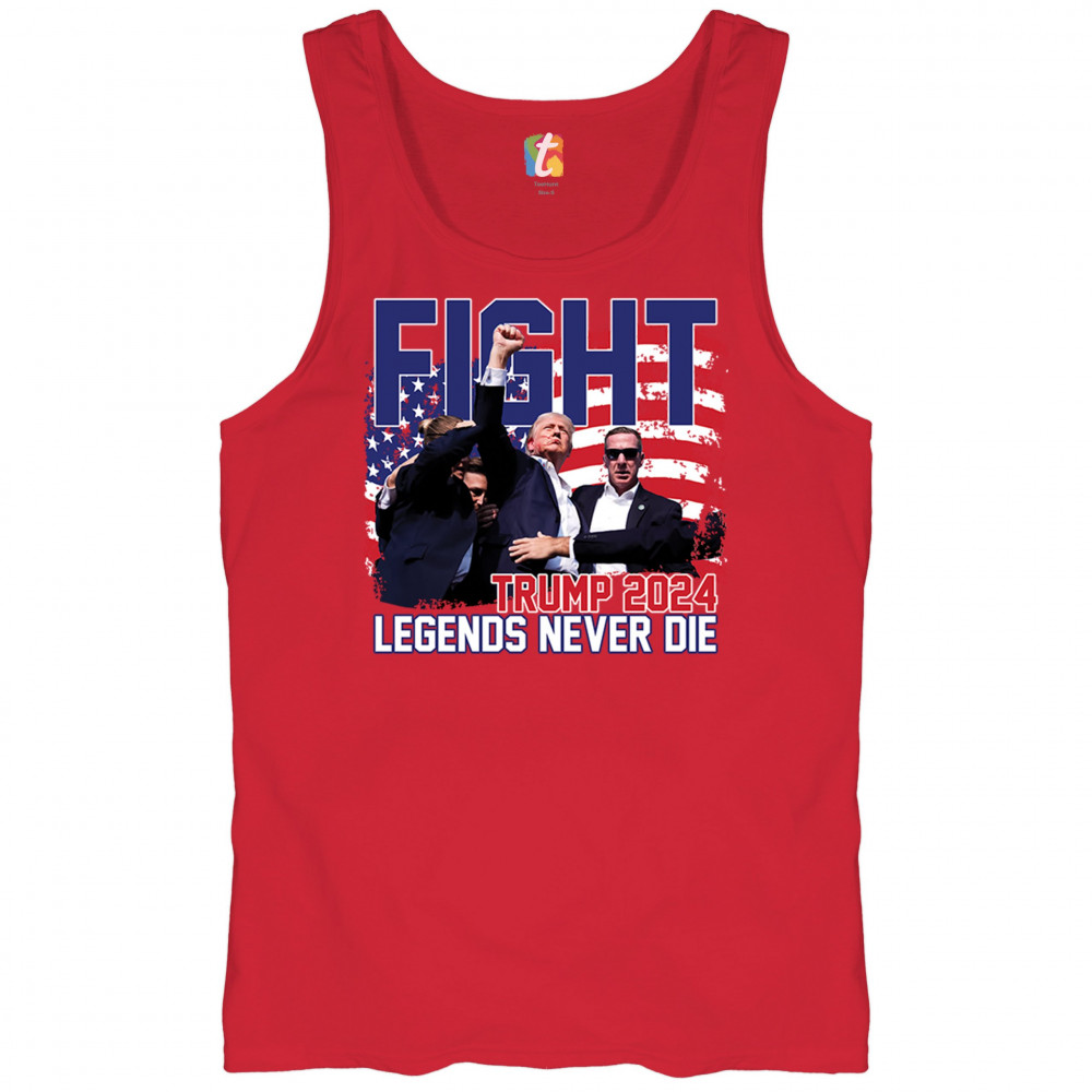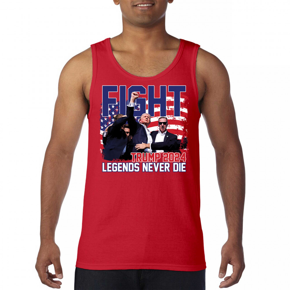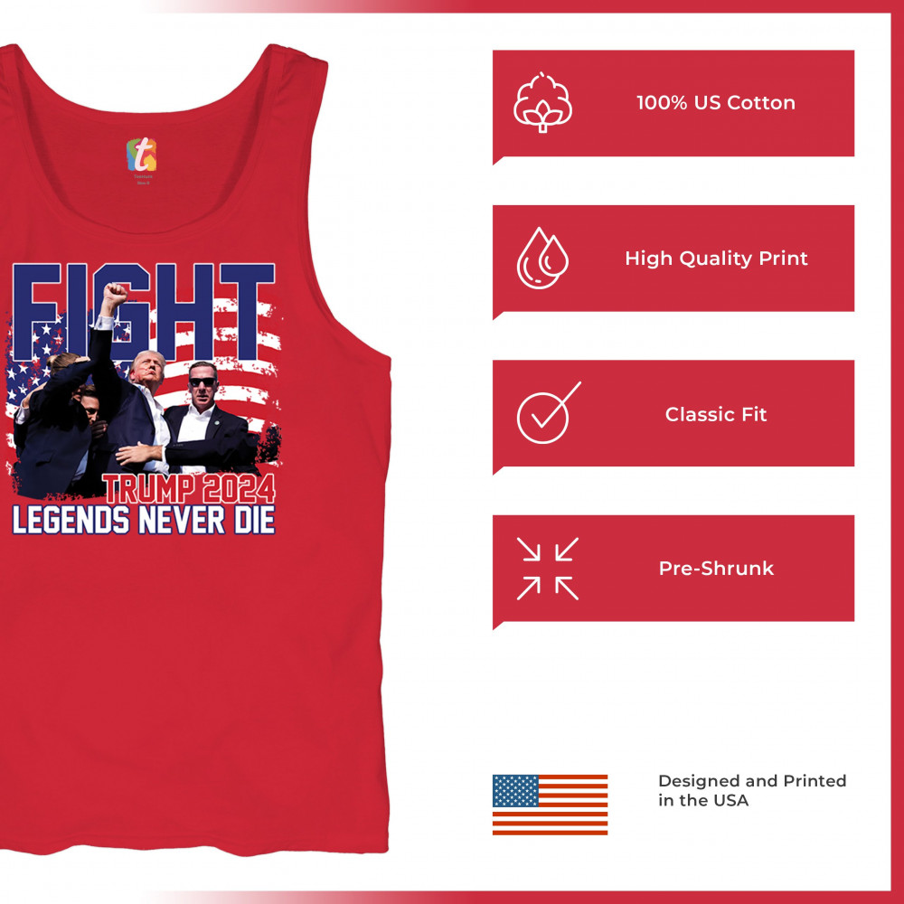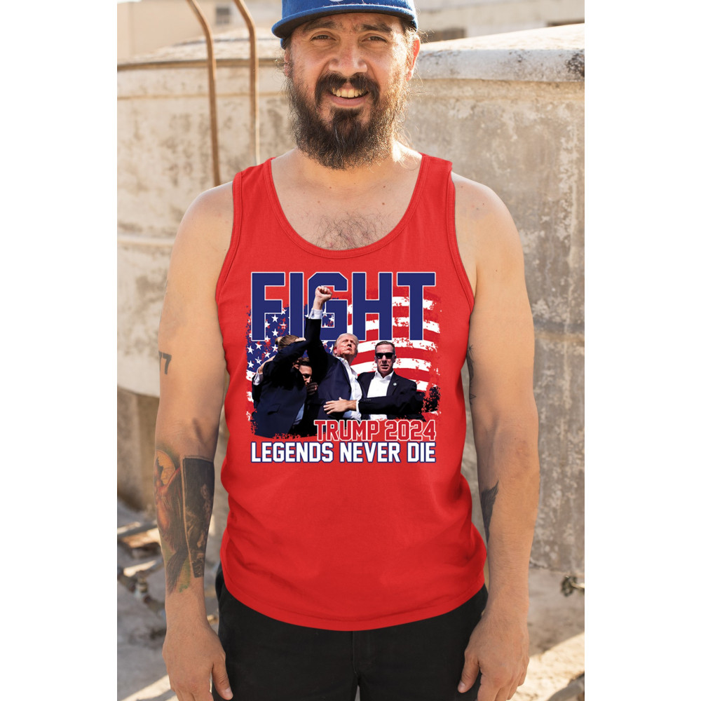 Show your Trump 2024 support with our bold "Fight" design, featuring "Legends Never Die" and a patriotic American flag. Perfect for rallies and everyday wear.