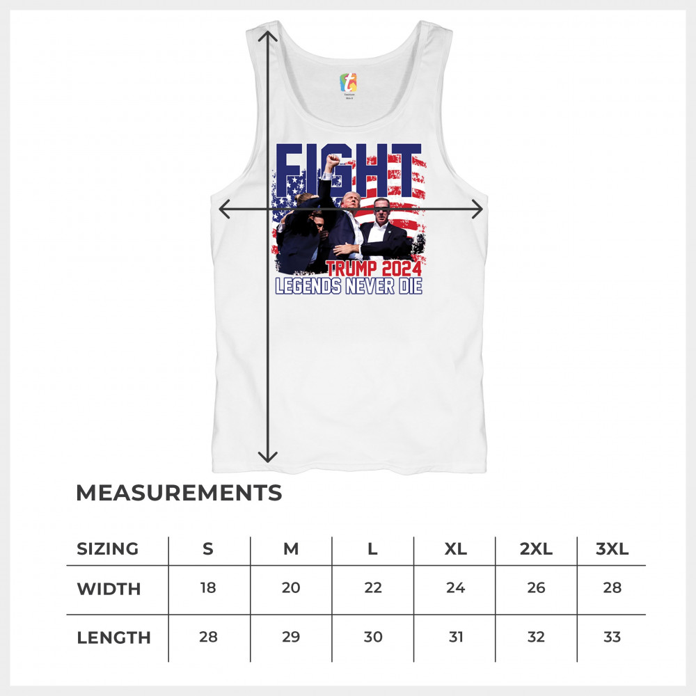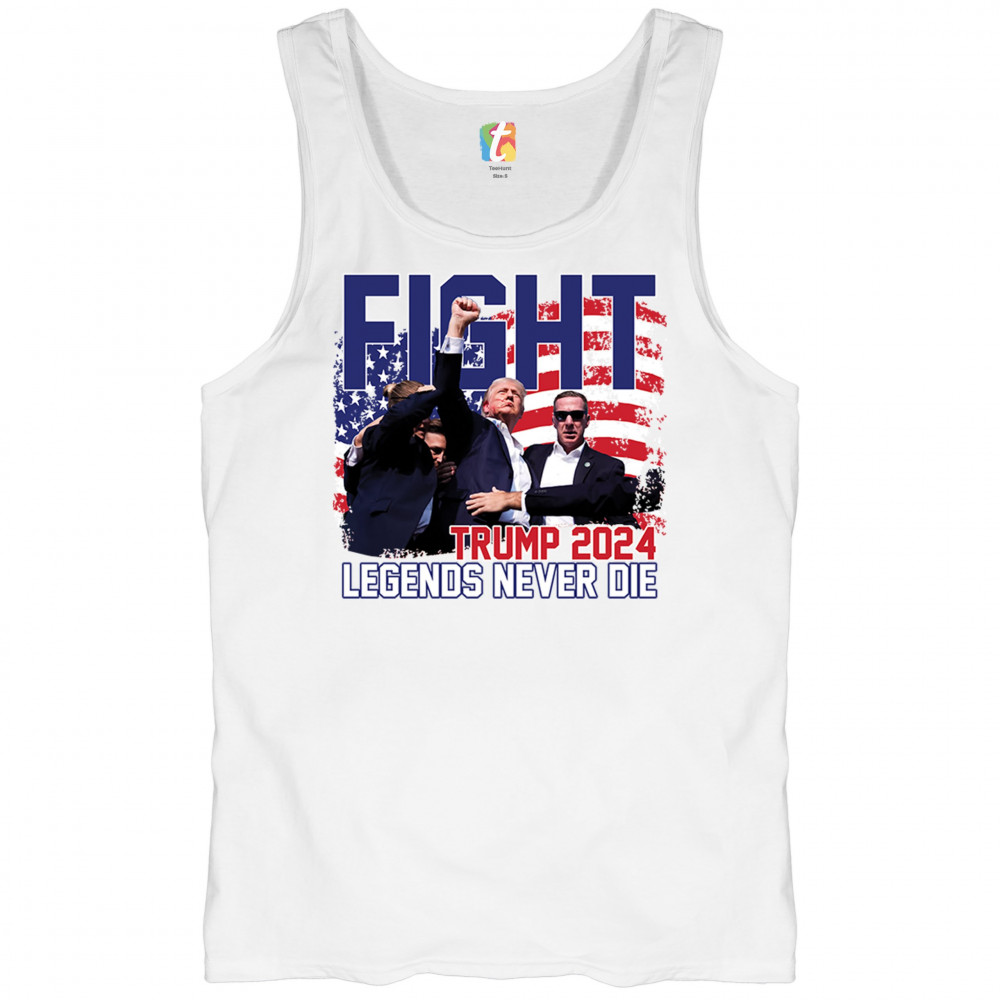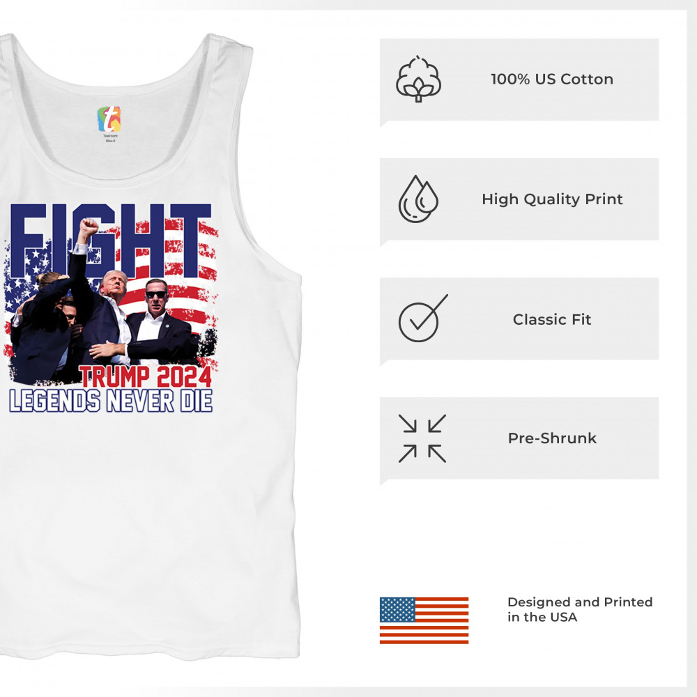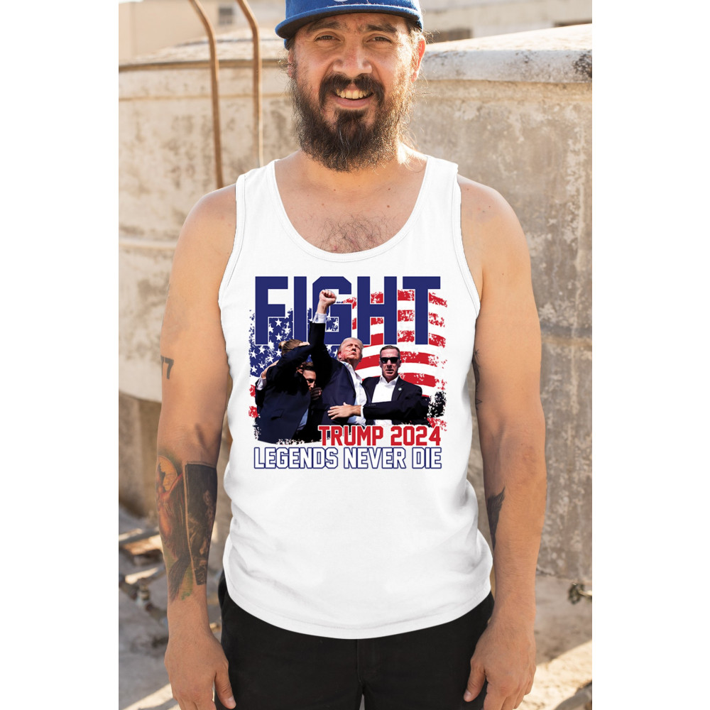 Show your Trump 2024 support with our bold "Fight" design, featuring "Legends Never Die" and a patriotic American flag. Perfect for rallies and everyday wear.