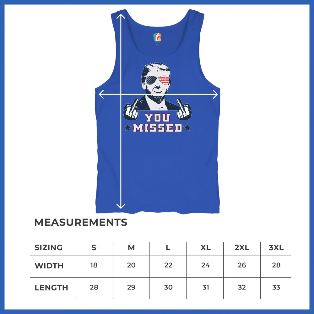 Express your patriotism and support for Donald Trump with this striking "You Missed" design, commemorating his survival of an assassination attempt during a Pennsylvania rally. The design features Trump in American flag sunglasses, defiantly flipping the bird, a bold statement of resilience. Ideal for rallies, political events, or casual wear, it symbolizes strength and unwavering support for conservative values. Show the world where you stand with this unique piece, perfect for any Trump supporter who believes in the America First agenda.