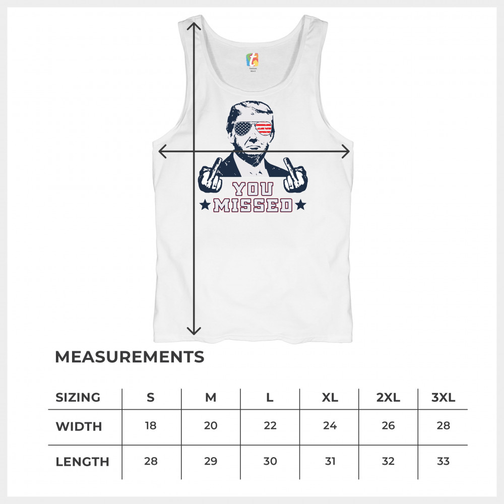 Express your patriotism and support for Donald Trump with this striking "You Missed" design, commemorating his survival of an assassination attempt during a Pennsylvania rally. The design features Trump in American flag sunglasses, defiantly flipping the bird, a bold statement of resilience. Ideal for rallies, political events, or casual wear, it symbolizes strength and unwavering support for conservative values. Show the world where you stand with this unique piece, perfect for any Trump supporter who believes in the America First agenda.