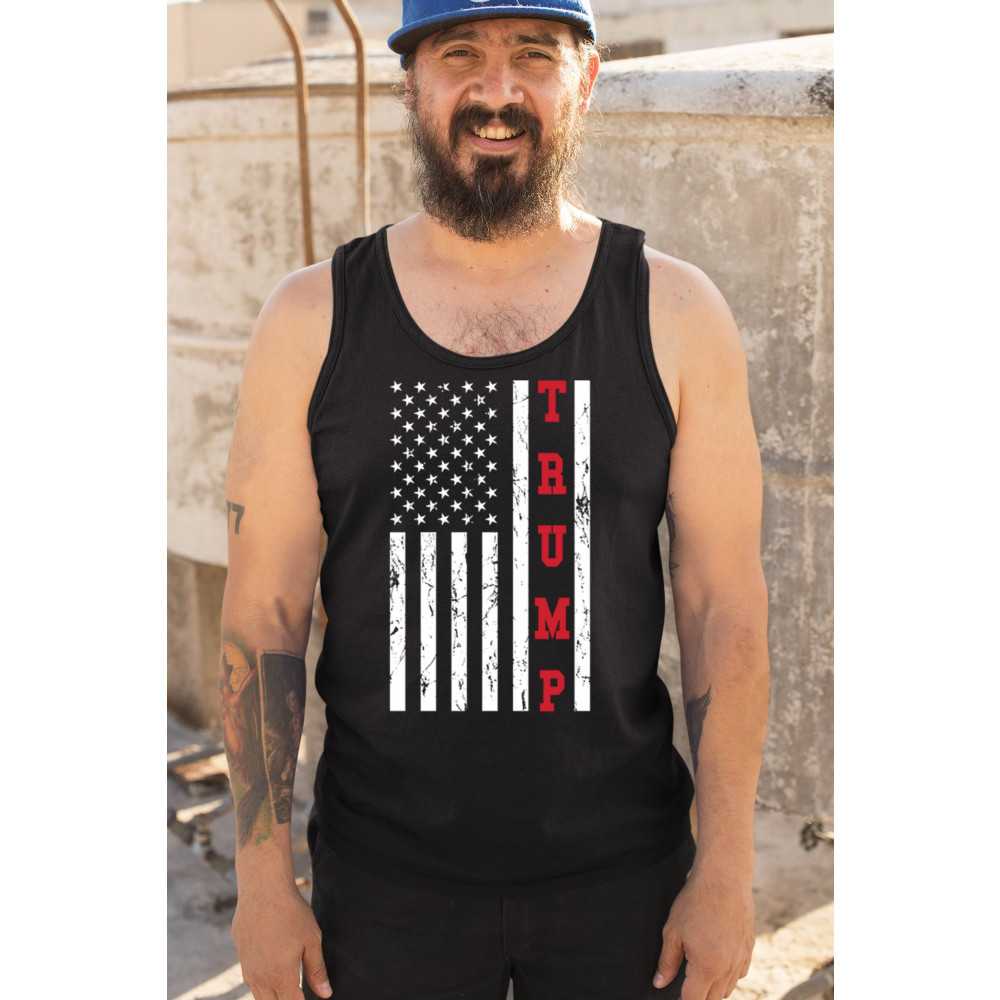 how your unwavering support for America First policies with our Trump 2024 Flag graphic t-shirt. This vintage-inspired design blends the iconic American Flag with bold 'Trump 2024' lettering, symbolizing a commitment to conservative values and the MAGA movement. Whether you're part of the Trump Train or a proud supporter, this shirt is a statement of victory and determination. Let's Go Brandon? More like Let's Go America! Join the Rebelution and make your voice heard with this Republican-themed merchandise.