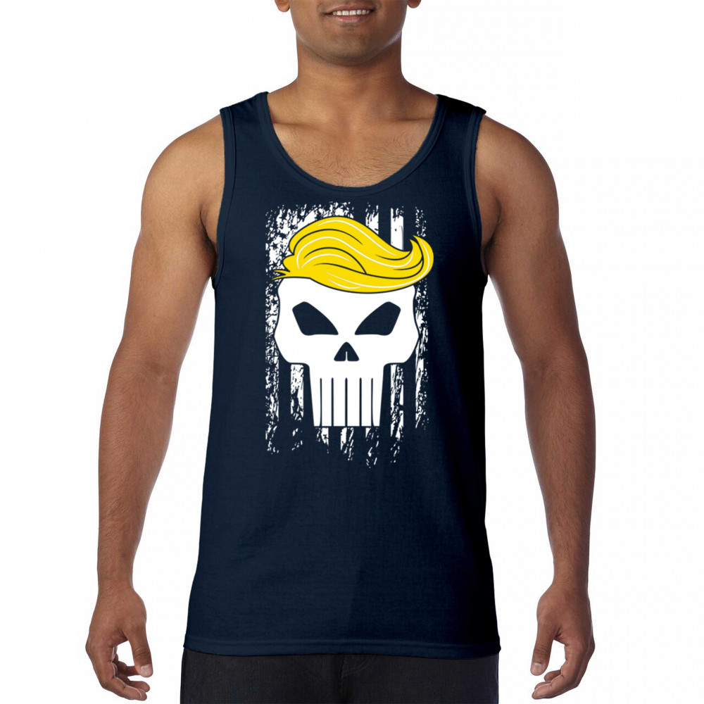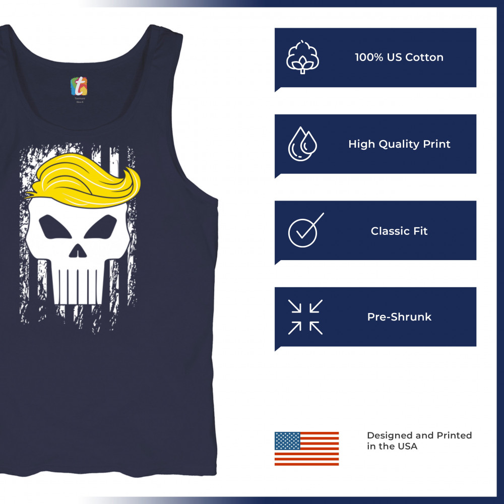 Explore our exclusive design - a symbol of unwavering support for America. Featuring a distressed flag and a skull with Trump's hair, it's perfect for patriotic conservatives