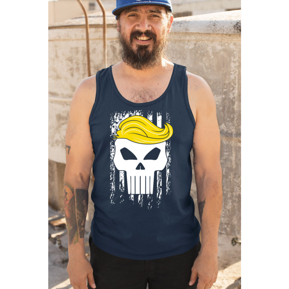 Embrace the strength of American values with our captivating design showcasing a distressed American flag and a skull donning President Trump's signature hairstyle. This symbol of victory and resilience is ideal for supporters of the conservative movement. Join the rebelution against the status quo and stand firm in your commitment to America first.