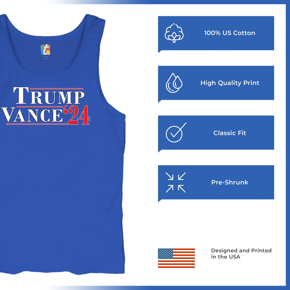 Show your support for Trump Vance 2024 with this patriotic design featuring bold red, white, and blue colors and a flag background. Perfect for rallies and conservative events.