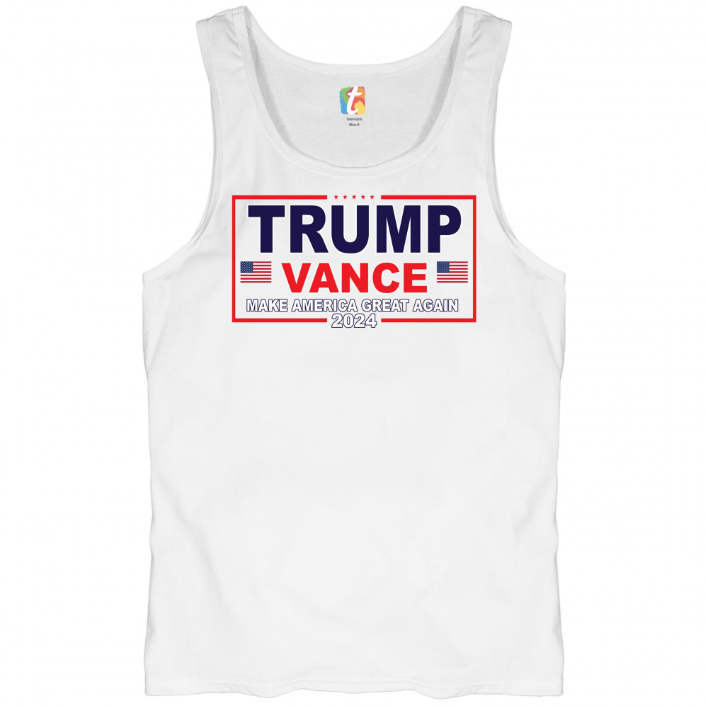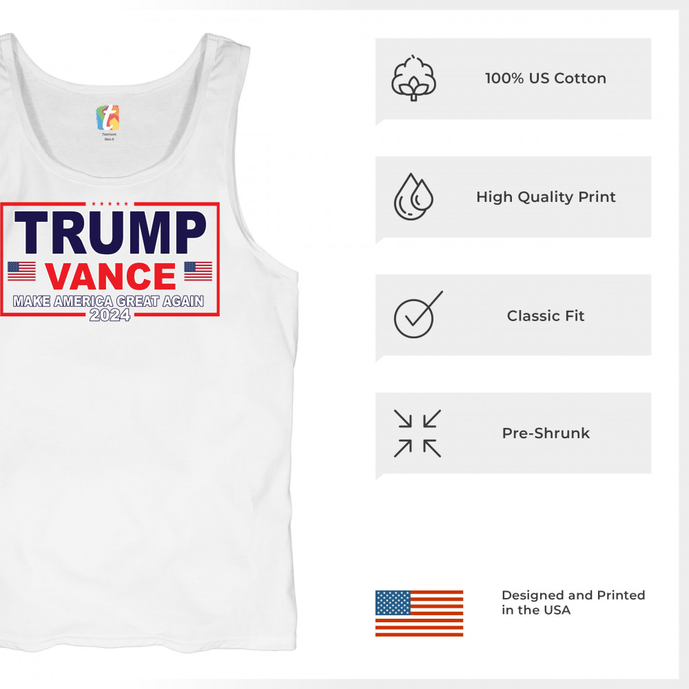 Showcase your support for the Trump-Vance 2024 campaign with this bold patriotic design featuring the American flag and "Make America Great Again" slogan.