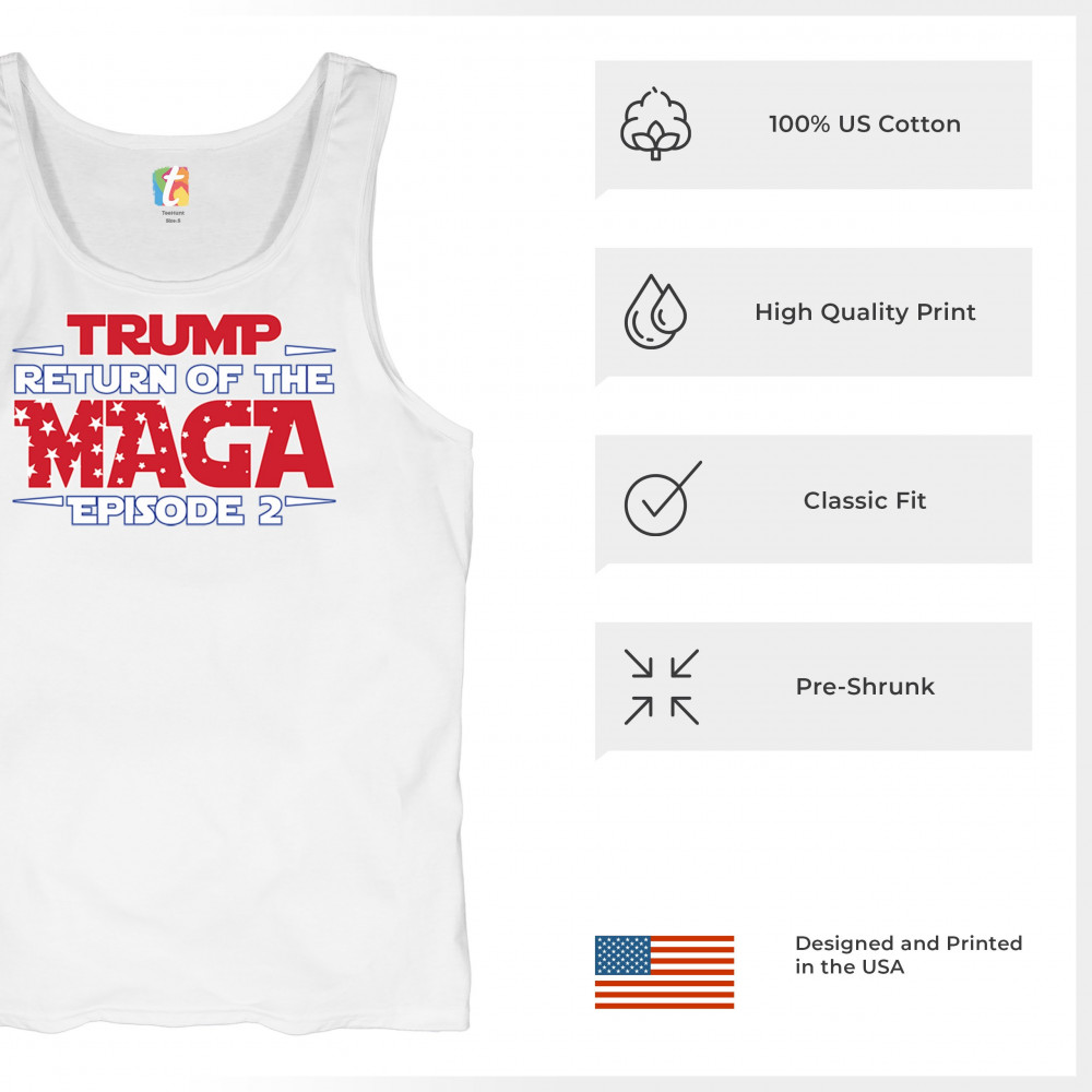 Make a bold statement with the "Return of the MAGA: Episode 2" design, celebrating Donald J. Trump and the Red Wave movement. Perfect for conservatives, Trump supporters, and Republicans who champion America First values, freedom, and the fight for a better future. A must-have for those who never surrender and stand for the people's mandate.