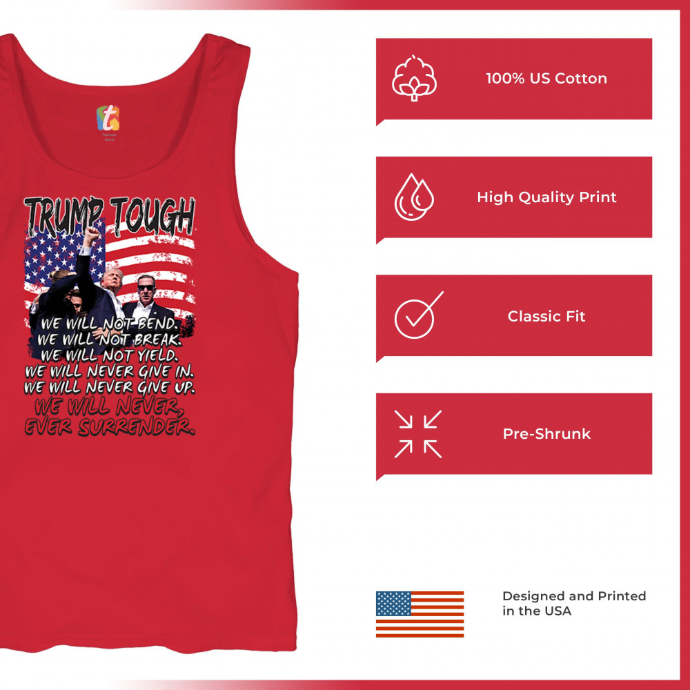 Express your support for Trump 2024 with this bold, patriotic design featuring the American flag and a powerful message. Never surrender your values.