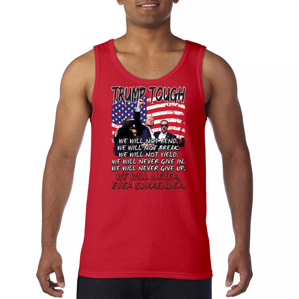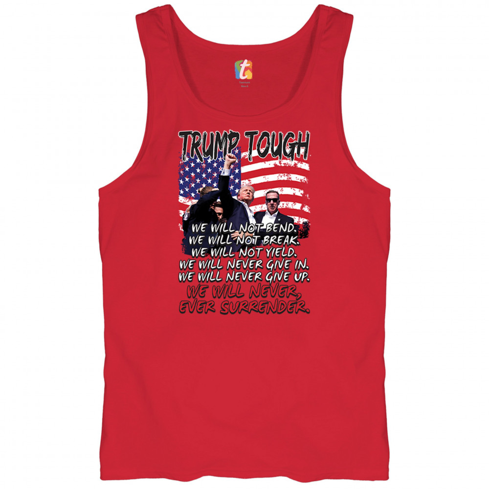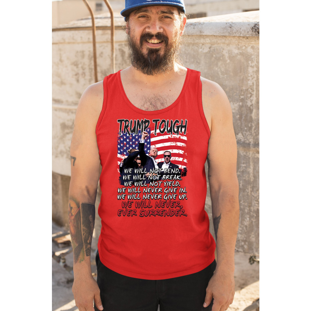 Display your unwavering support for Donald Trump with this powerful design. Crafted for those who believe in conservative values and the America First agenda, it’s perfect for any rally or event. With a striking image and the American flag in the background, this design embodies the spirit of those who refuse to give up or surrender. Show your dedication and pride every time you wear this. Join the movement and stand firm in your beliefs.