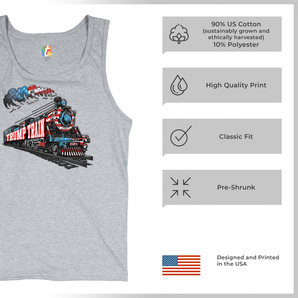 Hop on the Trump Train and support America First! This bold, patriotic tee is perfect for Republicans, conservatives, and the Red Wave movement.