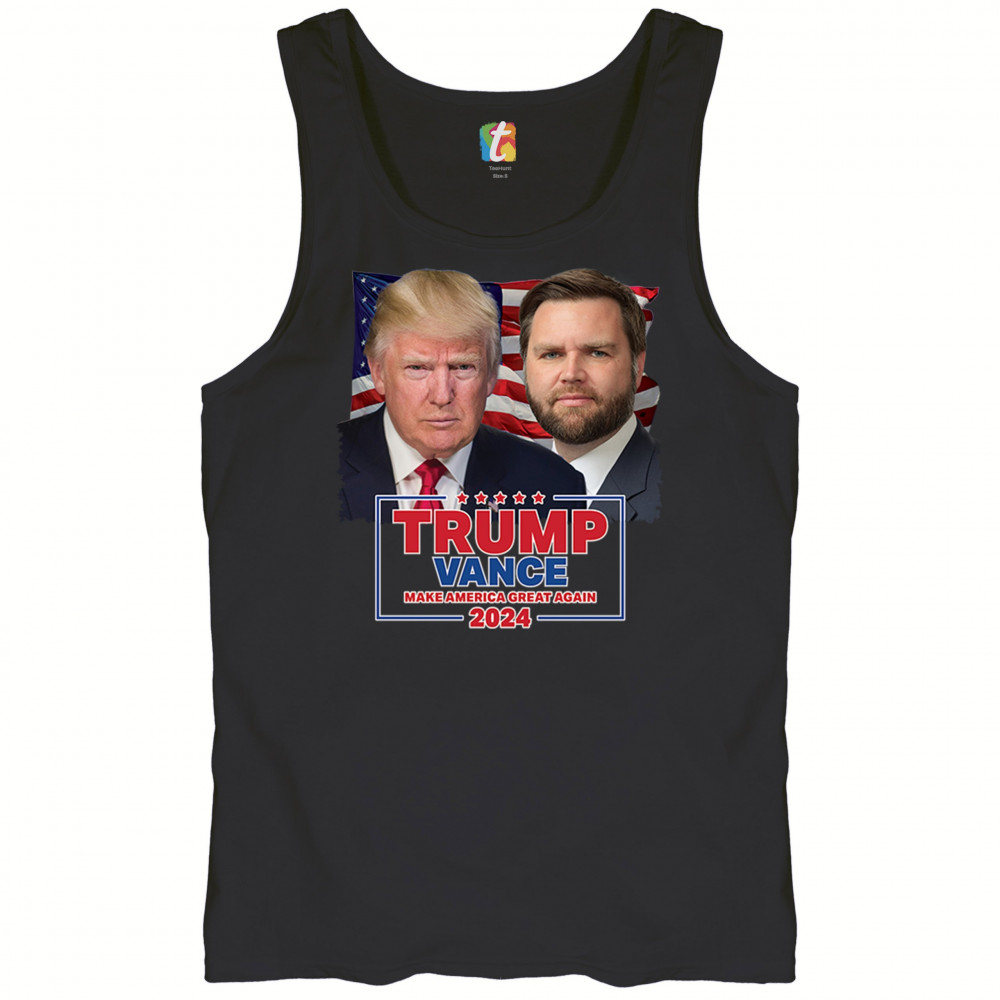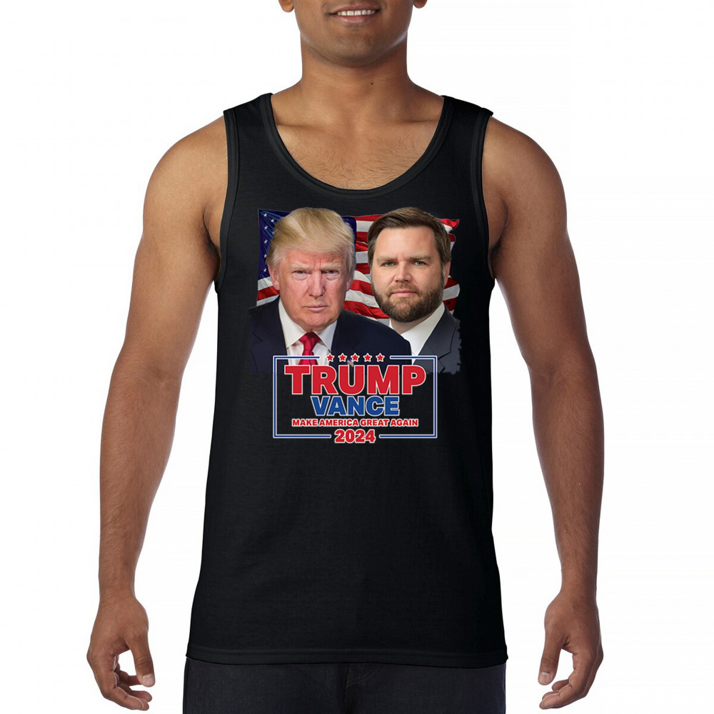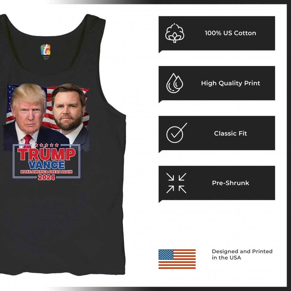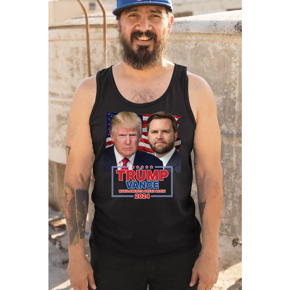 Show your support for Trump-Vance 2024 with this bold design featuring Trump and Vance against the American flag. Perfect for rallies and political events.