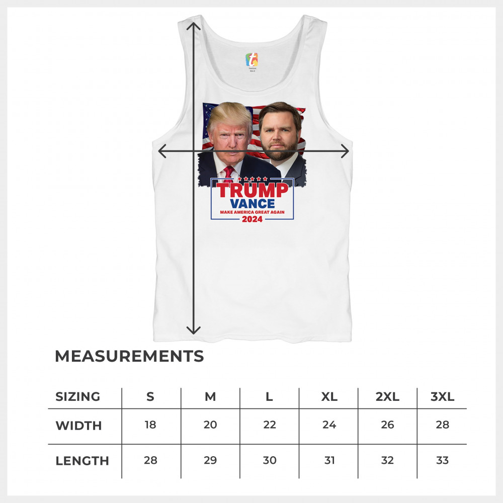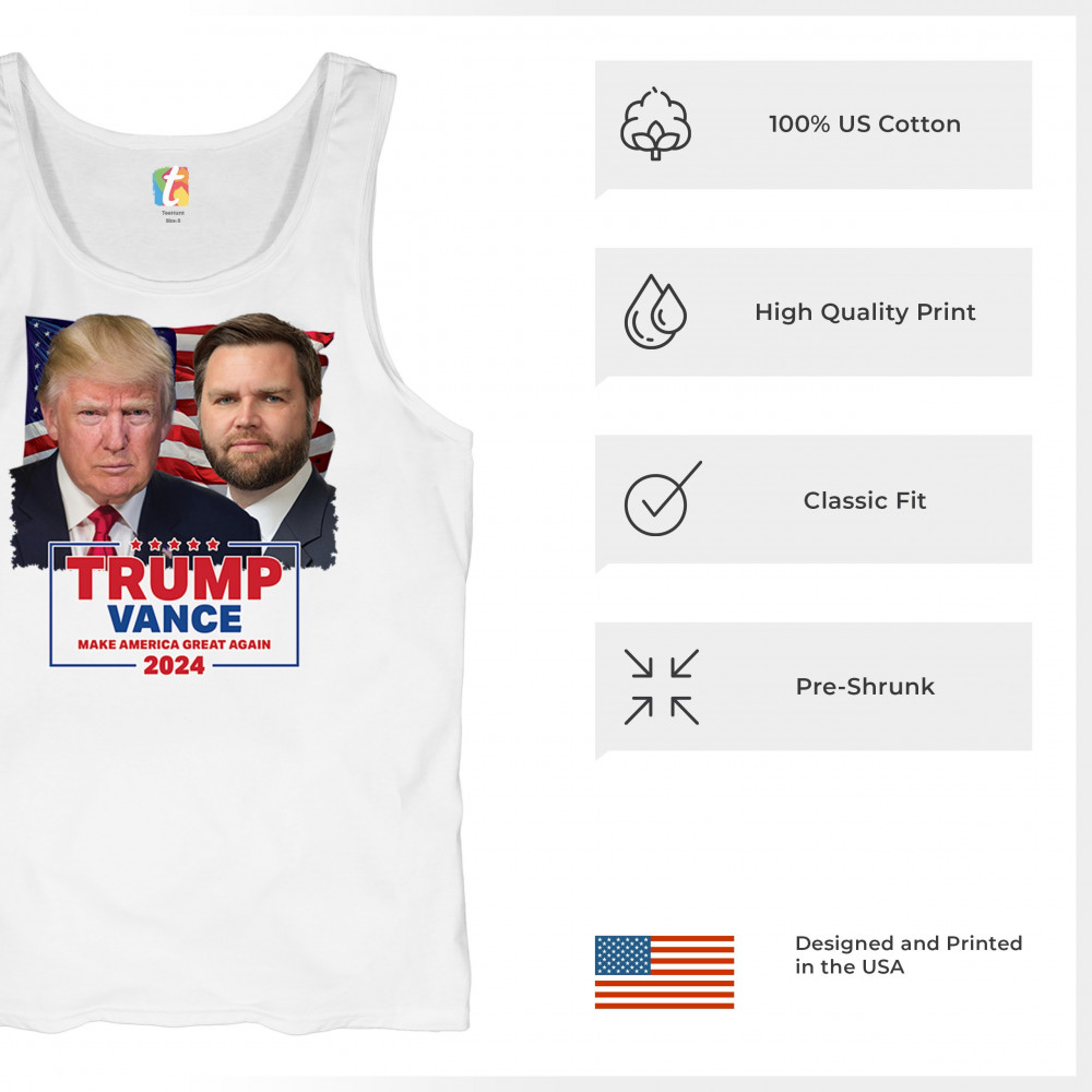 Show your support for Trump-Vance 2024 with this bold design featuring Trump and Vance against the American flag. Perfect for rallies and political events.