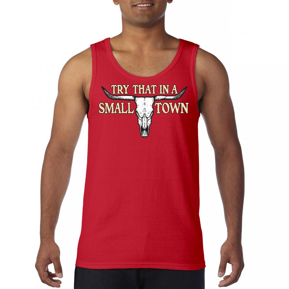 This design boldly proclaims "Try That in a SMALL TOWN," set against the backdrop of a stark cattle skull—a symbol deeply rooted in southern heritage and the undying American spirit. It's a tribute to the small-town sheriffs, the unwritten laws of backbone and duty, and the patriotic fervor that runs through the country's veins. Whether you're a motorcycle enthusiast, a Republican, or simply a connoisseur of all things vintage, this piece is a testament to enduring strength and local pride.