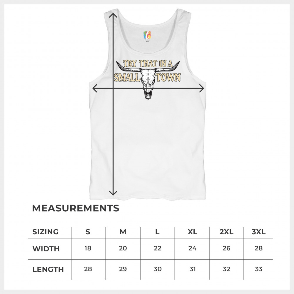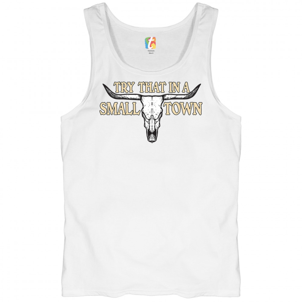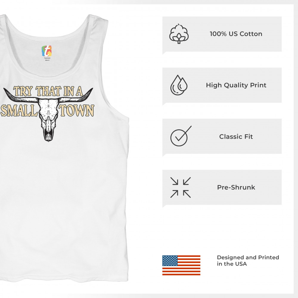 This design boldly proclaims "Try That in a SMALL TOWN," set against the backdrop of a stark cattle skull—a symbol deeply rooted in southern heritage and the undying American spirit. It's a tribute to the small-town sheriffs, the unwritten laws of backbone and duty, and the patriotic fervor that runs through the country's veins. Whether you're a motorcycle enthusiast, a Republican, or simply a connoisseur of all things vintage, this piece is a testament to enduring strength and local pride.