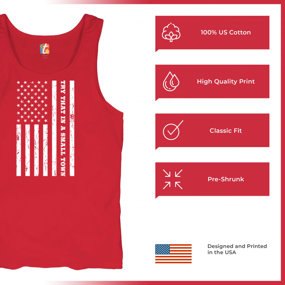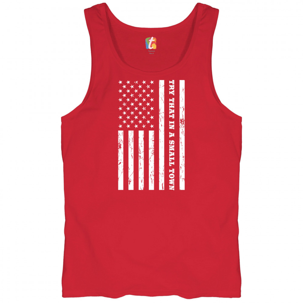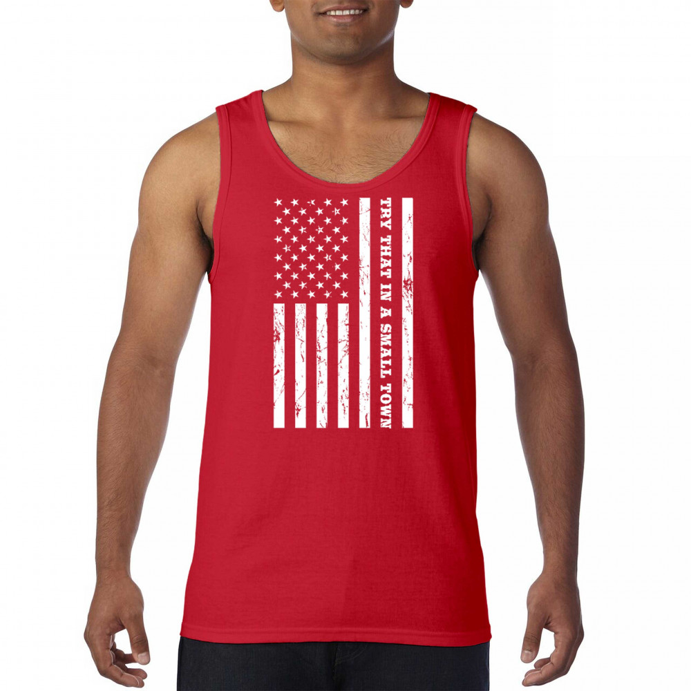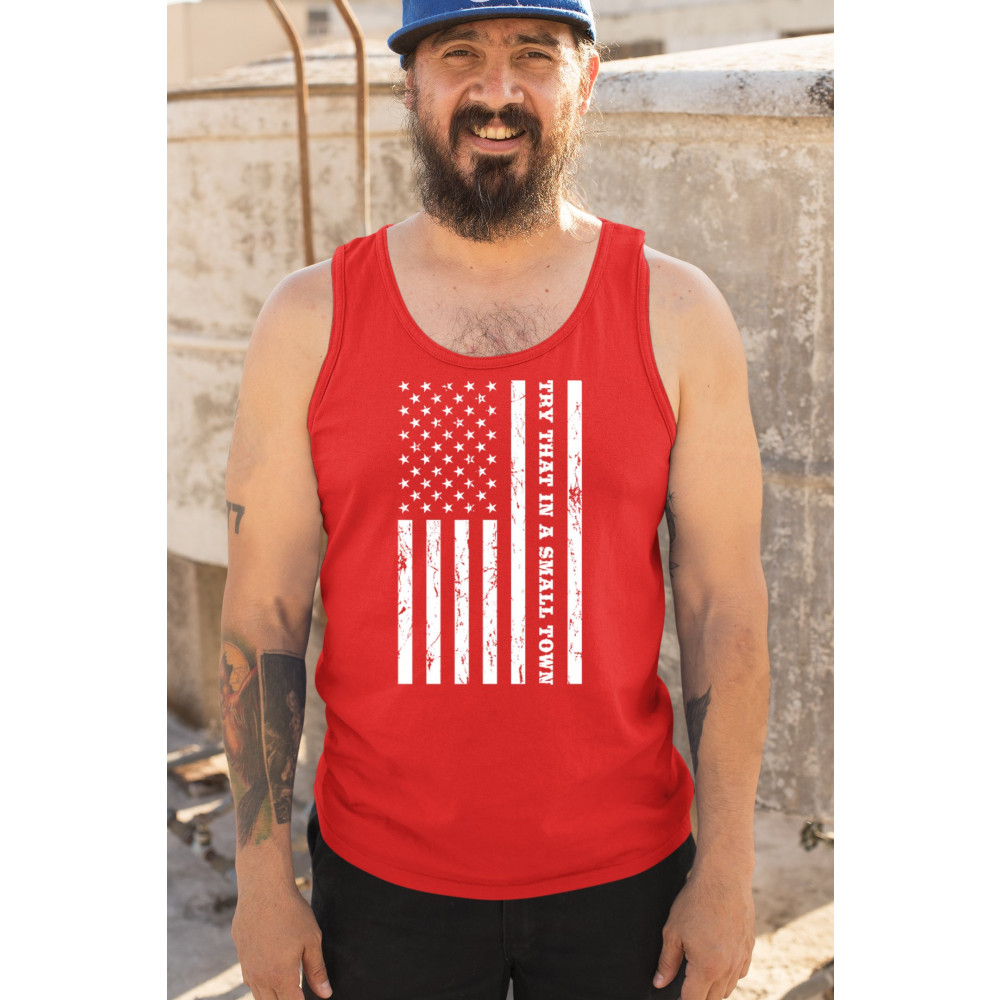 TRY THAT IN A SMALL TOWN GRUNGE AMERICAN FLAG tank top patriotic men's top red