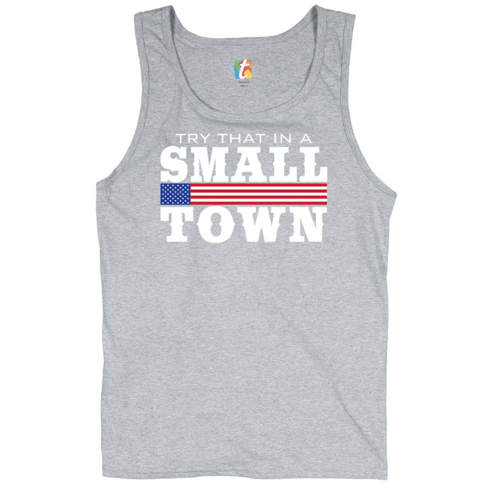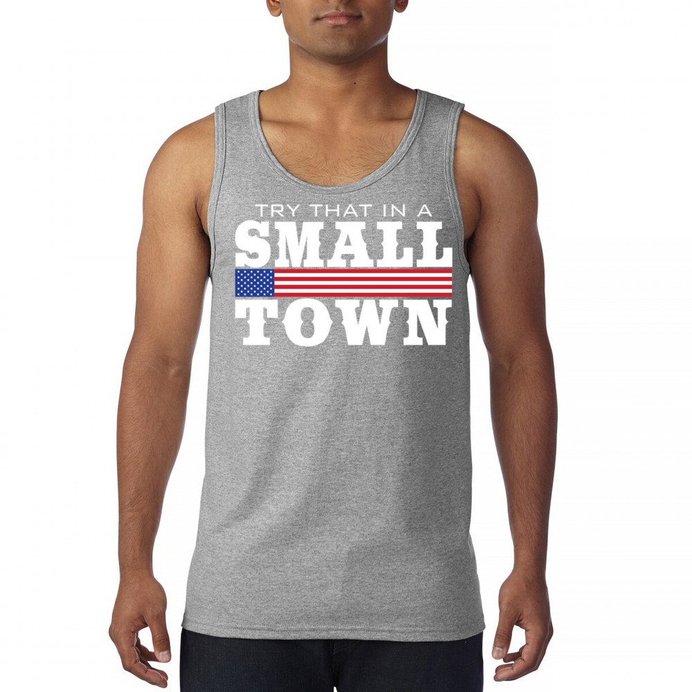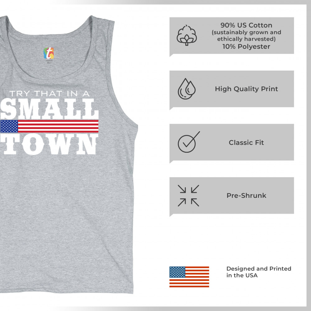 Celebrate small-town pride with our "Try That In A Small Town" design. Perfect for patriotic events, it features a bold American flag graphic.
