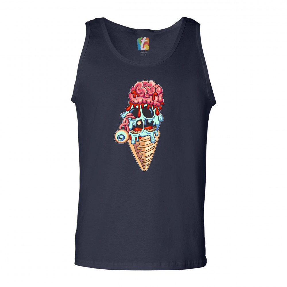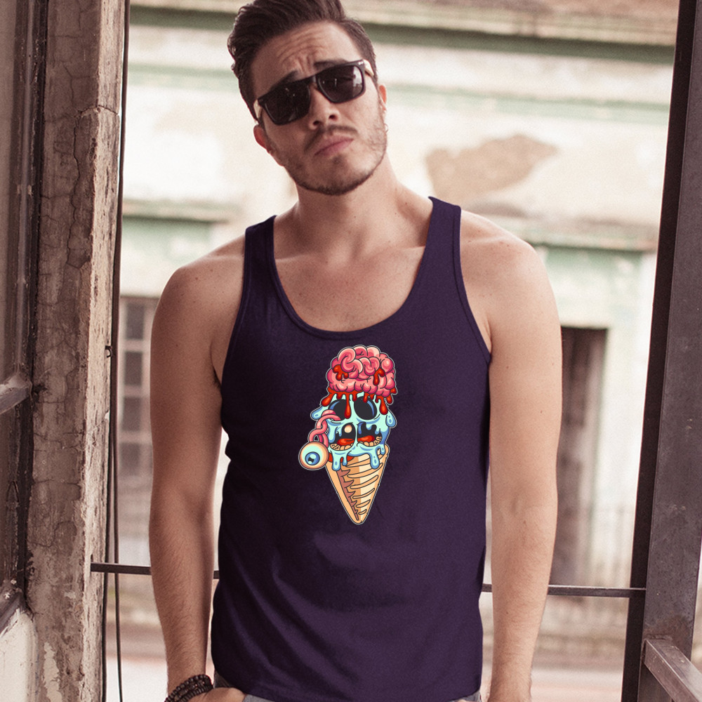 A print featuring an undead ice cream. The ice cream ball looks like a head of a zombie with an eye popping out and hanging and bloodied brains attached on top. A great choice for a person who is into horror movies, haunted houses and freaking people out!