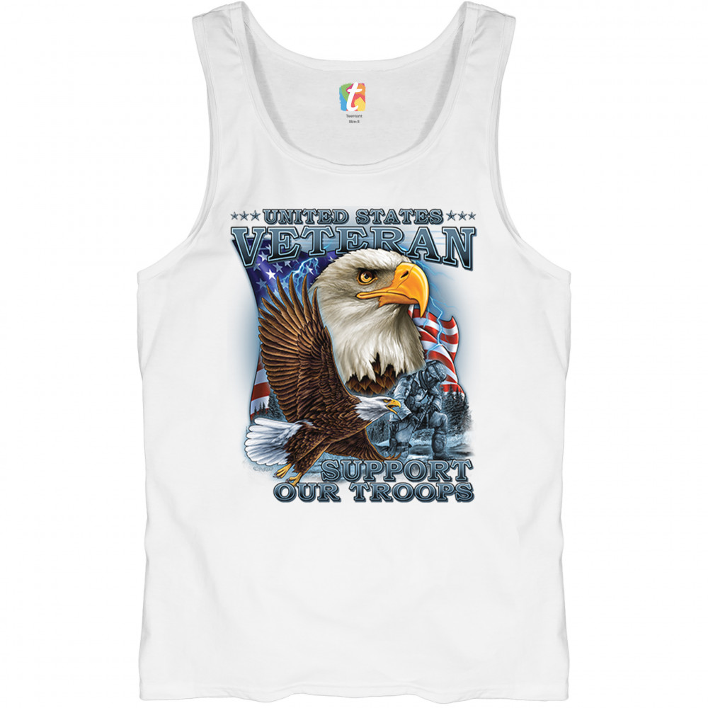 A patriotic print featuring a flying American bald eagle. There is another bald eagle covering most of the American flag in the background. There is a kneeling soldier in the front. The print says: "United States Veteran, Support our Troops". A great choice for a true patriot of the USA