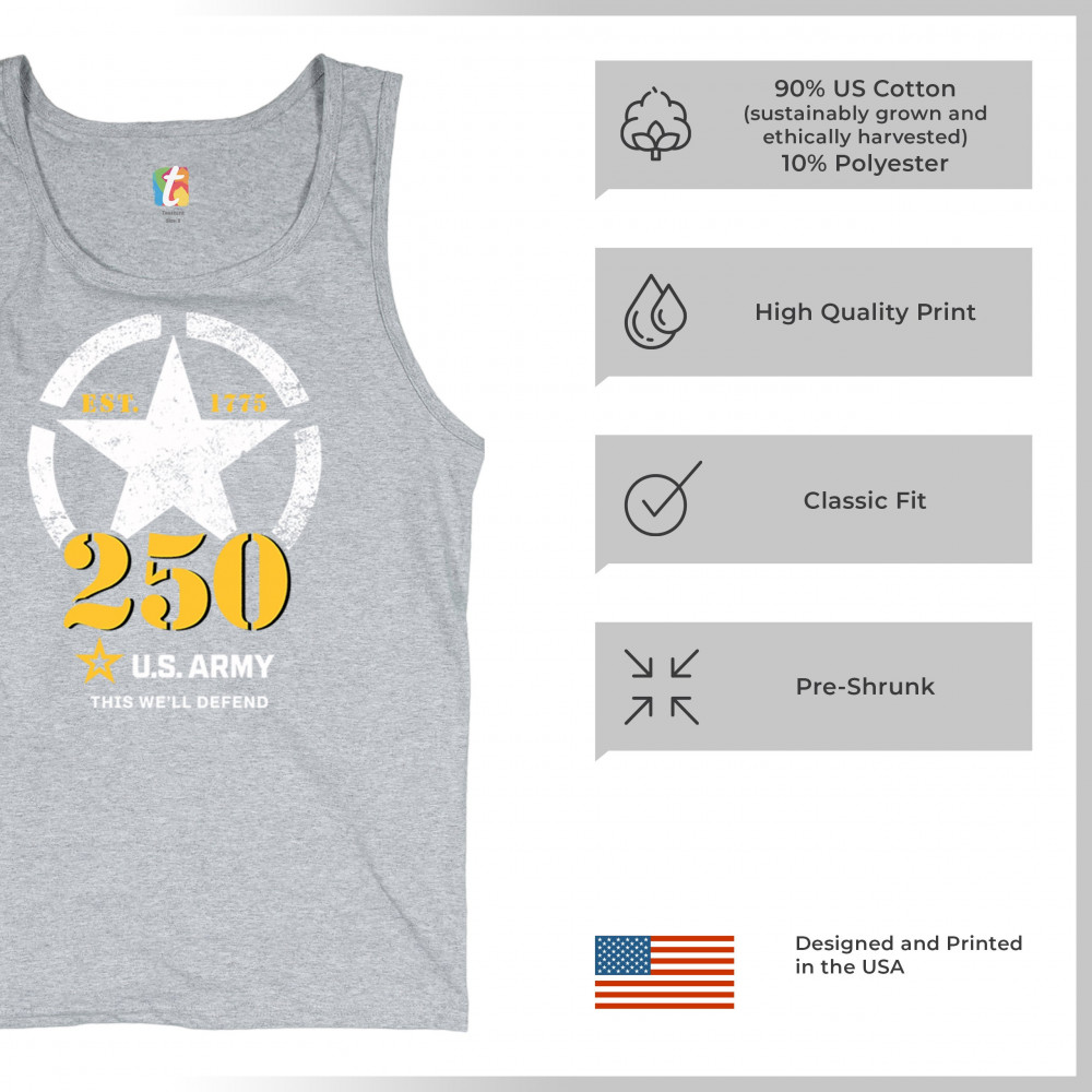 Celebrate 250 years of U.S. Army duty and pride with bold stencil design, EST 1775 mark, and patriotic “This We’ll Defend†motto.
