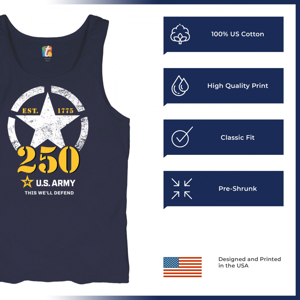 Celebrate 250 years of U.S. Army duty and pride with bold stencil design, EST 1775 mark, and patriotic “This We’ll Defend†motto.