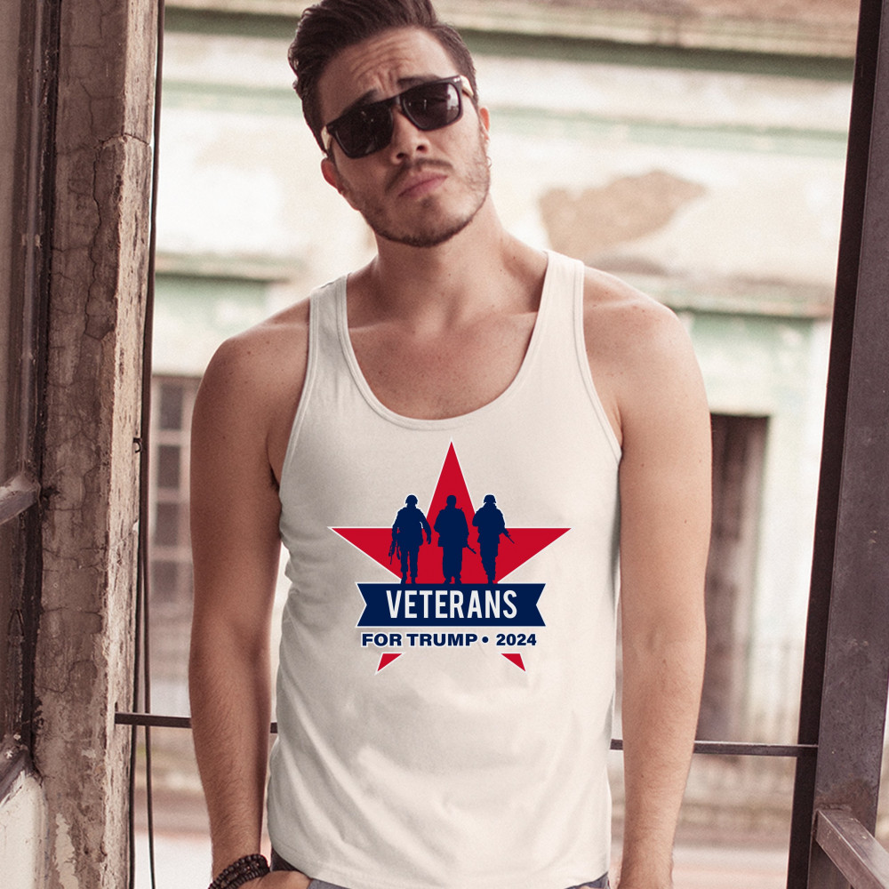 A political print saying "Veterans for Trump 2024". It also features three soldiers and a big red star in the background. A great choice to wear for a Trump rally or give as a gift to a Donald Trump before 2024 presidential elections.