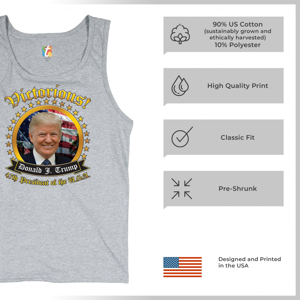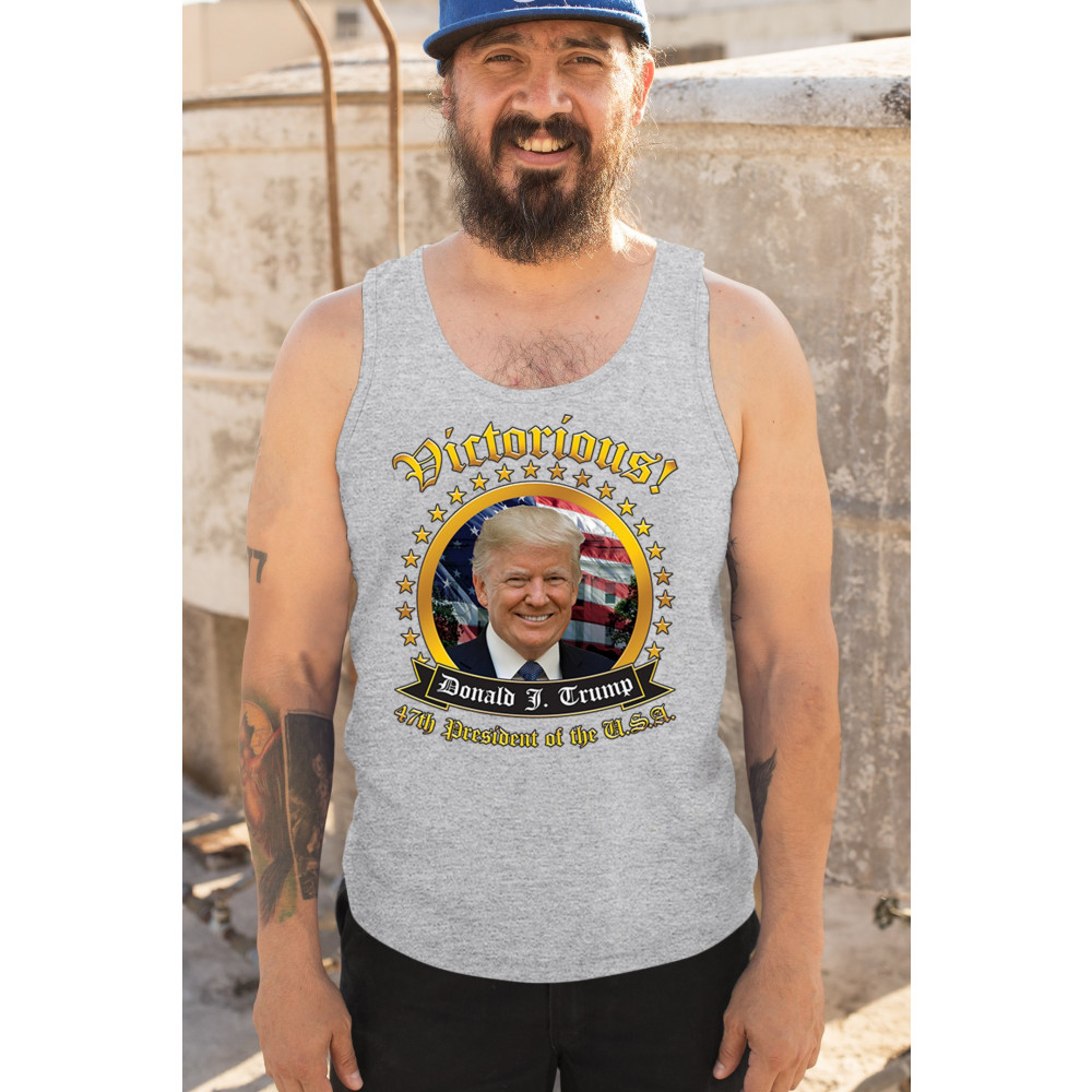 Showcase your support for Trump as the 47th President with this "Victorious" design. Perfect for patriots, America First advocates, and Red Wave supporters.