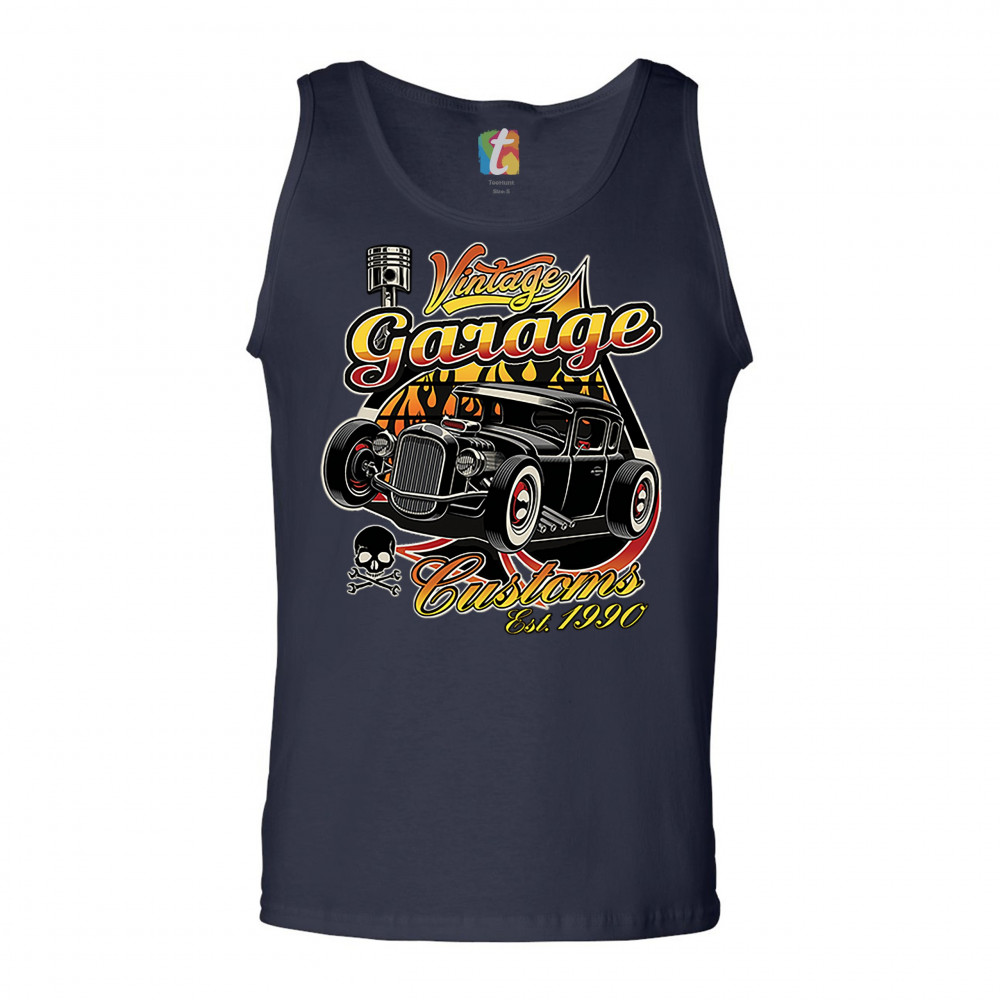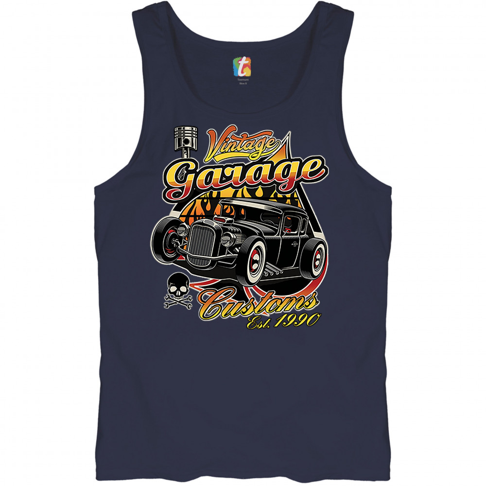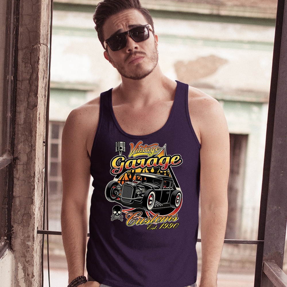 VINTAGE GARAGE CUSTOMS EST. 1990 tank top old school retro hot rod men's top navy blue
